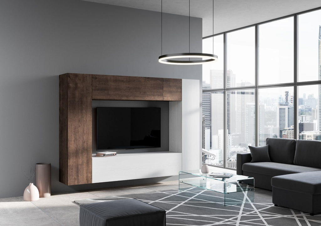 La parete attrezzata Isoka A06 può essere fissata al muro esattamente nella posizione che vedi nelle immagini, ma puoi anche personalizzarla secondo le tue esigenze. Infatti ogni elemento può essere posizionato a piacimento.