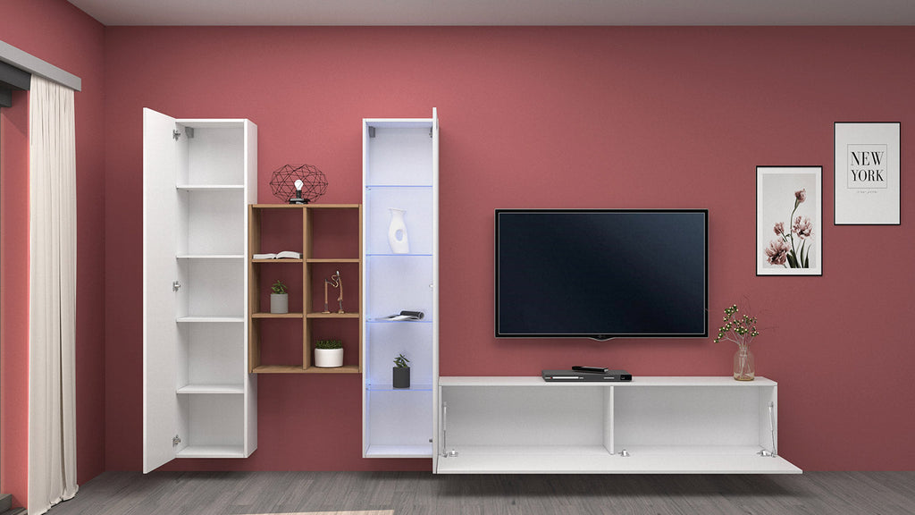 Il soggiorno MARUSKA n°15 è una parte realizzata con 1 colonna armadio, una vetrina, un porta TV e una libreria a 6 scomparti, perfetta per chi legge molto e ha la necessità di riporre diversi volumi. La parete può essere poggiata al pavimento o agganciata alla parete. La colonna armadio si caratterizza da un'anta a battente con, all’interno 4 ripiani in legno, la vetrina ha, invece, un'anta con cornice in vetro e 4 ripiani in vetro all'interno. Il porta TV, che completa la parete, è proposto con un'anta la cui posizione è personalizzabile a destra o a sinistra. La struttura del soggiorno MARUSKA n°15 è realizzata in melaminico laccato bianco lucido, mentre la libreria è in rovere wotan. La sua forma innovativa la rende adatta a diversi stili di arredamento e viene fornita con un kit di montaggio con istruzioni facili e dettagliate.