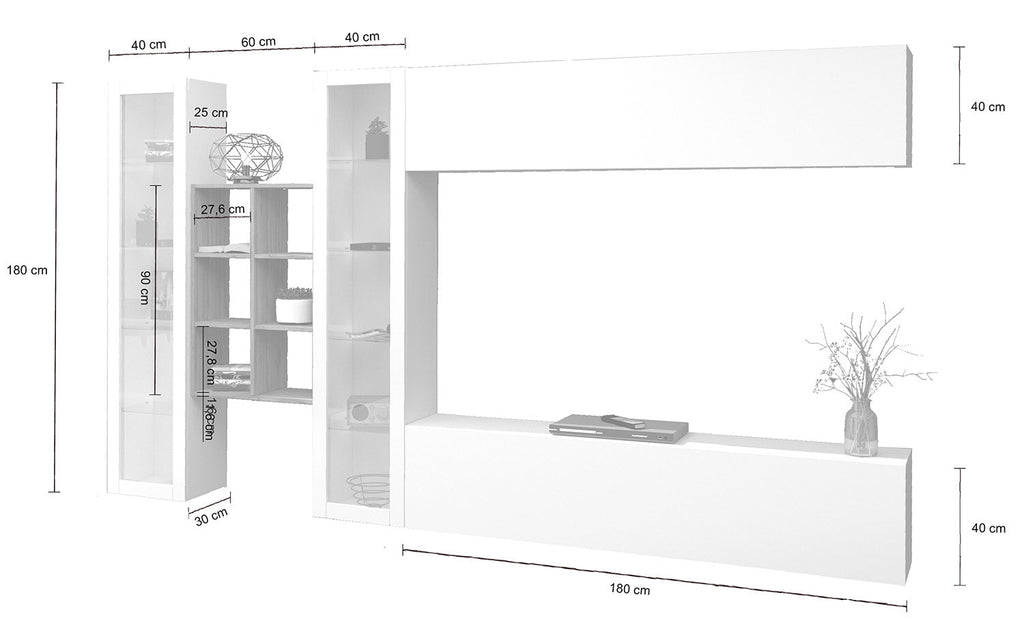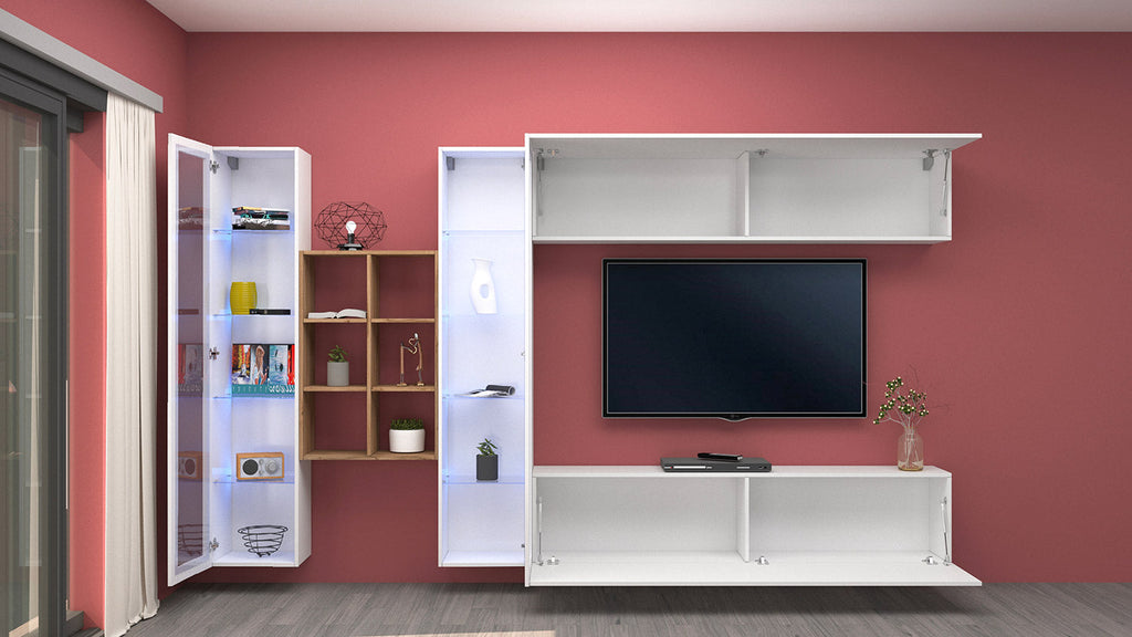 Il soggiorno MARUSKA n°17 da 320 cm è caratterizzato da 2 vetrine, 1 mobile TV, 1 vasistas e una libreria a 6 vani. Le vetrine si presentano con 1 anta intelaiata con vetro e 4 ripiani interni sempre in vetro. Le ante del porta TV e della vasistas sono regolate con bracci a gas e possono essere personalizzate decidendo se posizionarle a destra o a sinistra. L’intero soggiorno, realizzato in melaminico bianco laccato lucido con la libreria in rovere wotan, può essere montato sia poggiante sul pavimento che appeso alla parete. La forma originale e innovativa del soggiorno MARUSKA n° 17 si adatta in maniera perfetta a qual sia si stile di arredo e può essere montato facilmente grazie al kit incluso nella confezione.