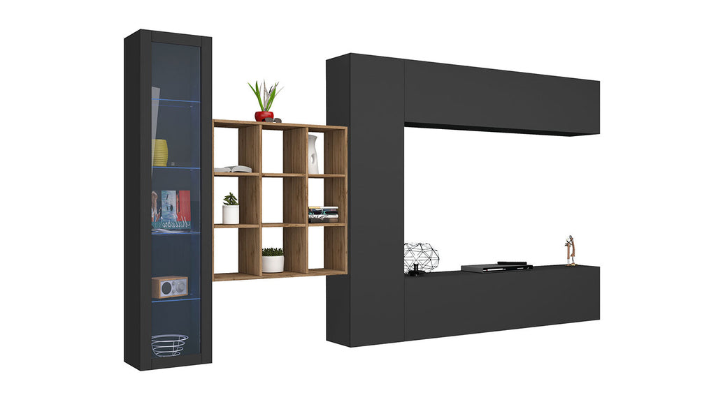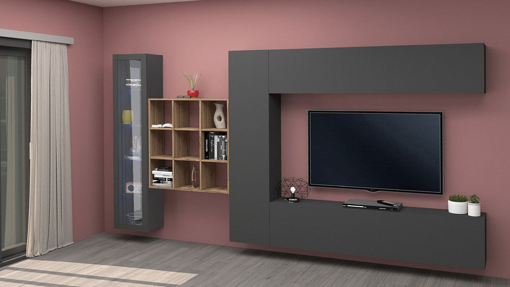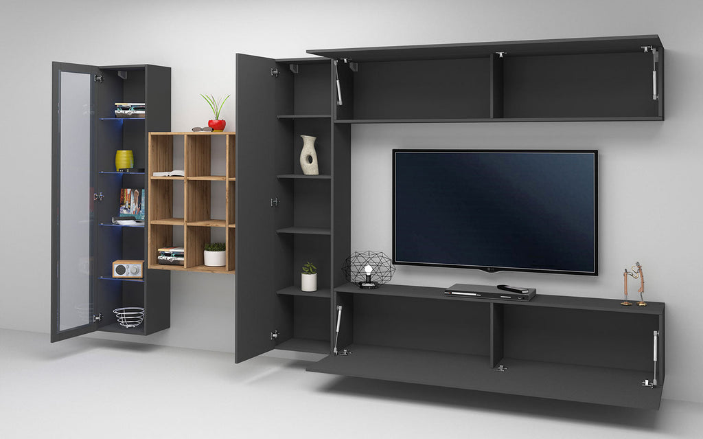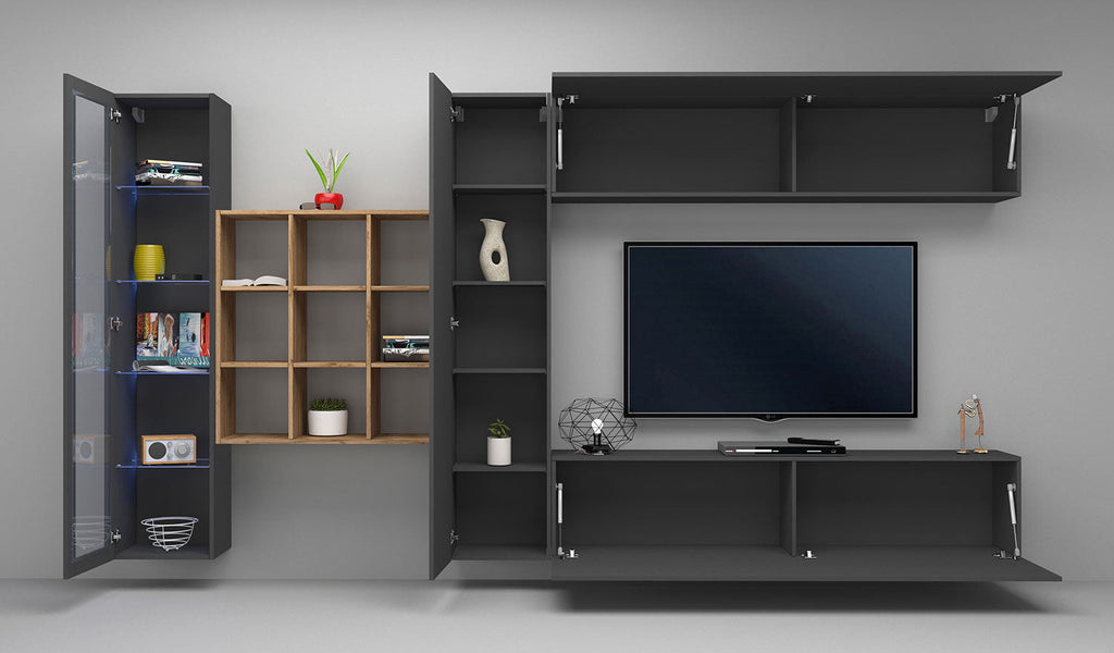 Parete Attrezzata Soggiorno 350x30x180 cm Maruska n°23 Grigio Antracite Opaco/Rovere Wotan