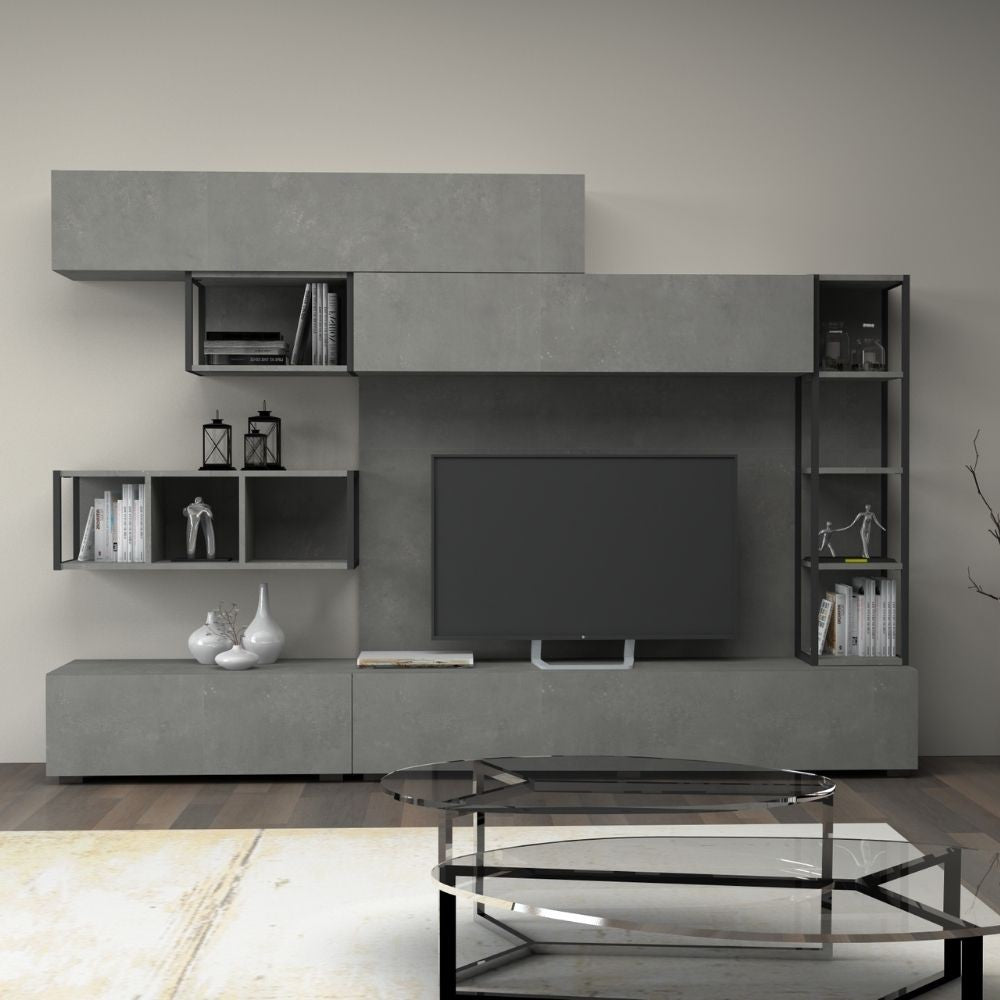 Parete attrezzata 260 cm beton Tronador. La Parete attrezzata 260 cm è composta da base con due ante a ribalta (una da 170 cm e l’altra da 90 cm), colonna a giorno con 4 ripiani, un pensile libreria da 90 cm, un pensile libreria da 50 cm, un pensile con anta a ribalta da 140 cm, un pensile con anta a ribalta da 160 cm, Colore beton.