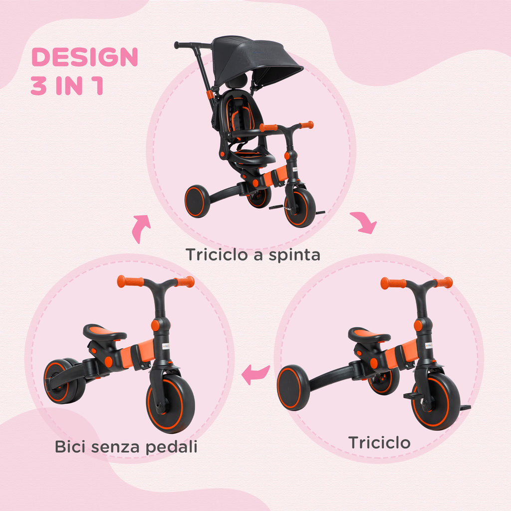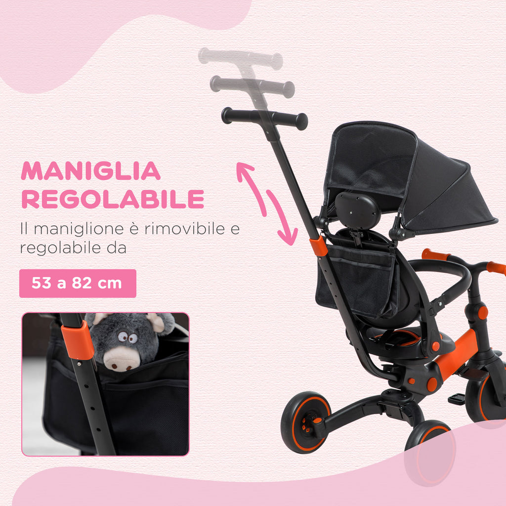 Accompagna i tuoi bambini verso l'avventura con questo triciclo con maniglione che cresce insieme a loro. Il design 3 in 1 ti permette di usarlo come passeggino, triciclo a spinta e triciclo normale. La ruota frontale completamente chiusa impedisce che i bimbi si facciano male accidentalmente. Il maniglione regolabile in altezza si adatta agli adulti e il tettuccio inclinabile ti permette di proteggere i bimbi dal sole.