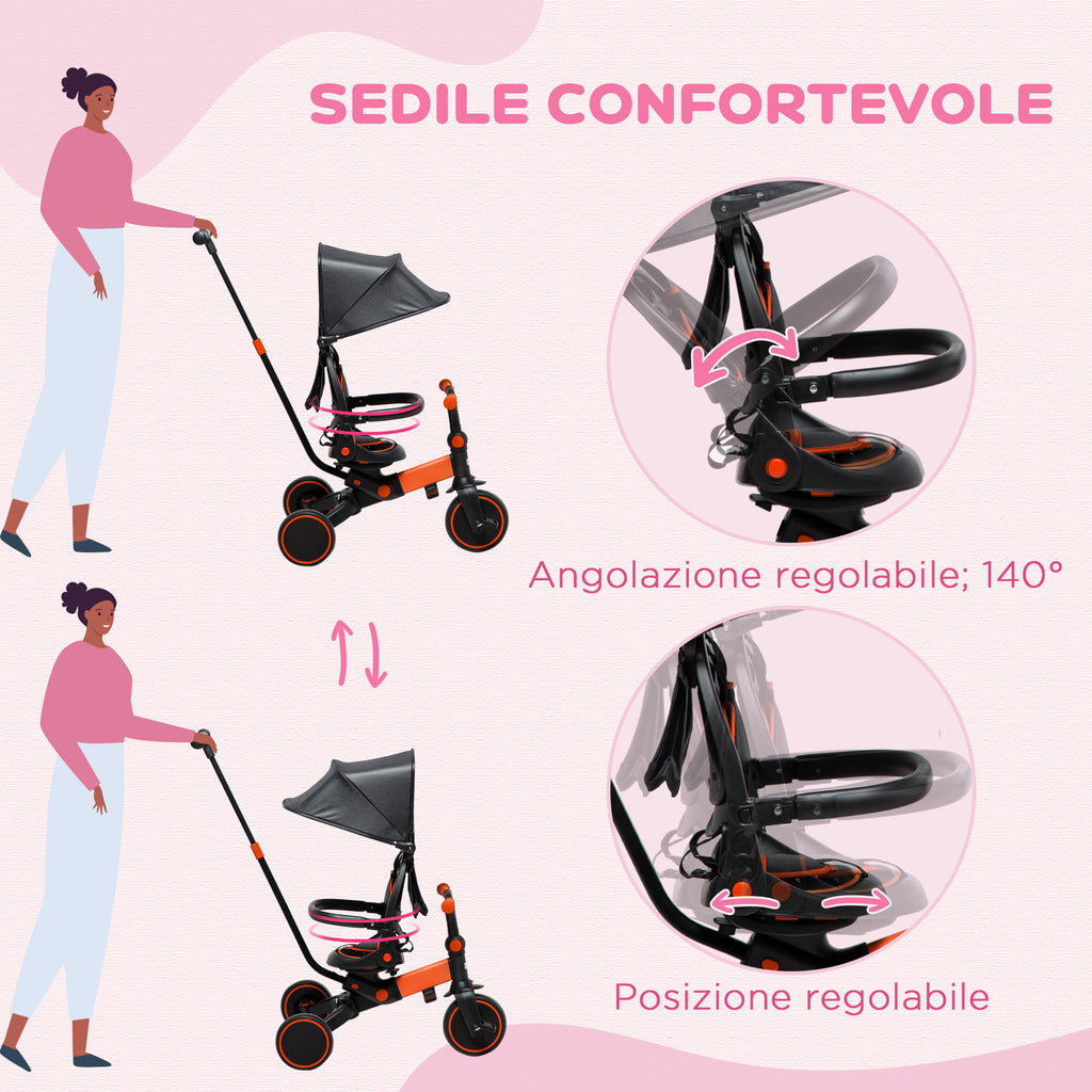 - COMPLETAMENTE REGOLABILE: Il maniglione è regolabile in altezza da 53 a 82 cm, per adattarsi all'altezza degli adulti. Il triciclo con maniglione è dotato anche di un tettuccio parasole regolabile, per proteggere i piccoli dal sole a ogni ora del giorno. Il sedile può essere girato verso il maniglione, così i bimbi potranno vedere i genitori che spingono il triciclo in modalità passeggino. Lo schienale può anche essere reclinato fino a 140° per il comfort dei bambini