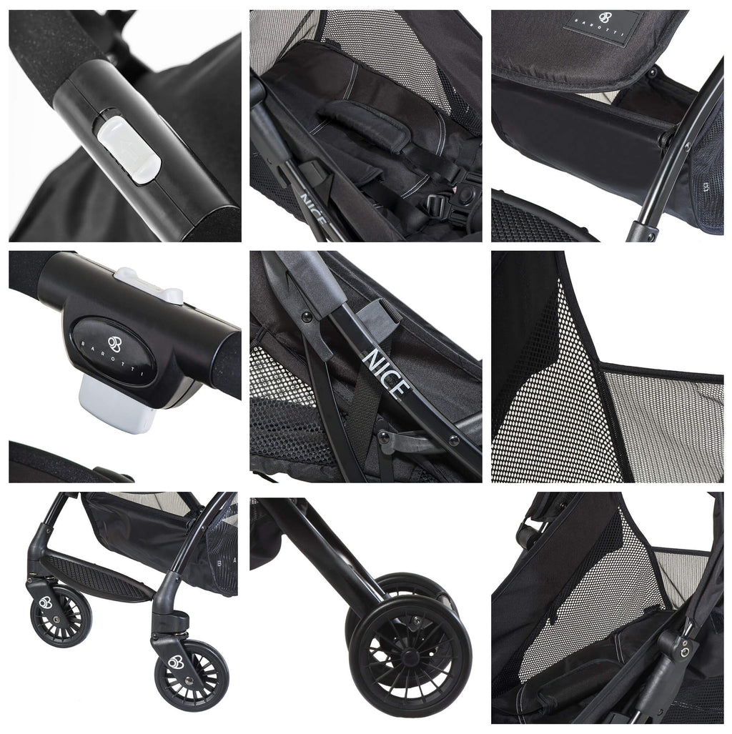 Nice è il nuovo passeggino ultraleggero di Barotti, dal design innovativo e alla moda, totalmente traspirante, utile soprattutto nelle ore più calde della giornata, tussuto completamente sfoderafile e lavabile, chiuso si trasforma in un trolley pratico e maneggevole, compatibile con le dimensioni del bagaglio a mano in aereo.