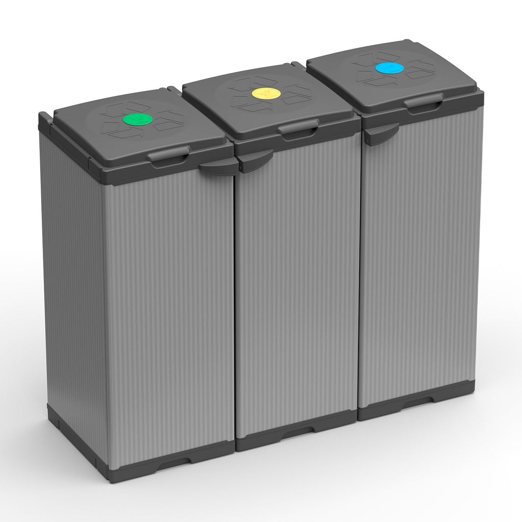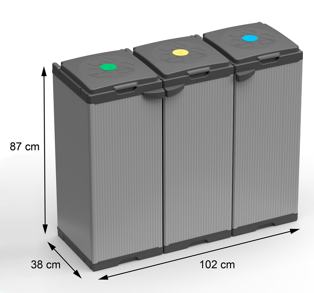 Il mobile portasacco tris, di dimensioni 102L x 38P x 87H cm, è la proposta dal design semplice e lineare offerta da Mongardi per la raccolta differenziata. I pannelli laterali e le ante sono in resina di PVC. I coperchi, dotati di ferma sacco, le basi, i montanti, le maniglie ed i dischetti colorati sono in resina di PP. Il materiale usato per realizzare questo prodotto è di seconda vita certificato. Adatto a sostenere tre sacchi da 80 a 110 L. Resistente alle intemperie e stabile, è adatto all’impiego sia in ambienti interni che in ambienti esterni. Il montaggio, semplice e veloce, non prevede l’utilizzo di viti o attrezzi ed è guidato da un foglio di istruzioni illustrato. Il mobile portasacco tris 7824 fa parte della serie Modular System, in quanto è predisposto ad essere unito in serie ad altri articoli della linea Storage del marchio Mongardi.