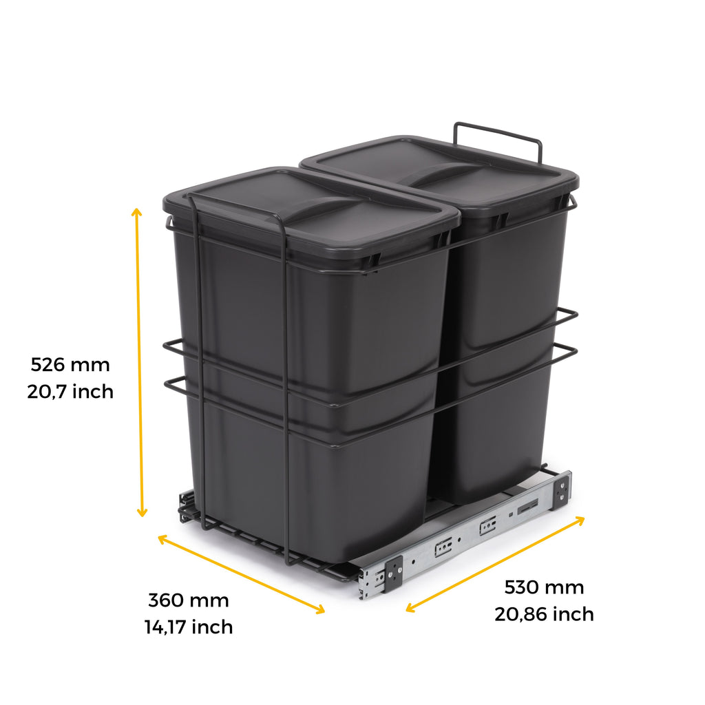 Ha due bidoni della spazzatura con una capacità di 35 litri ciascuno. È realizzato in acciaio e plastica con un'elegante finitura grigio antracite.