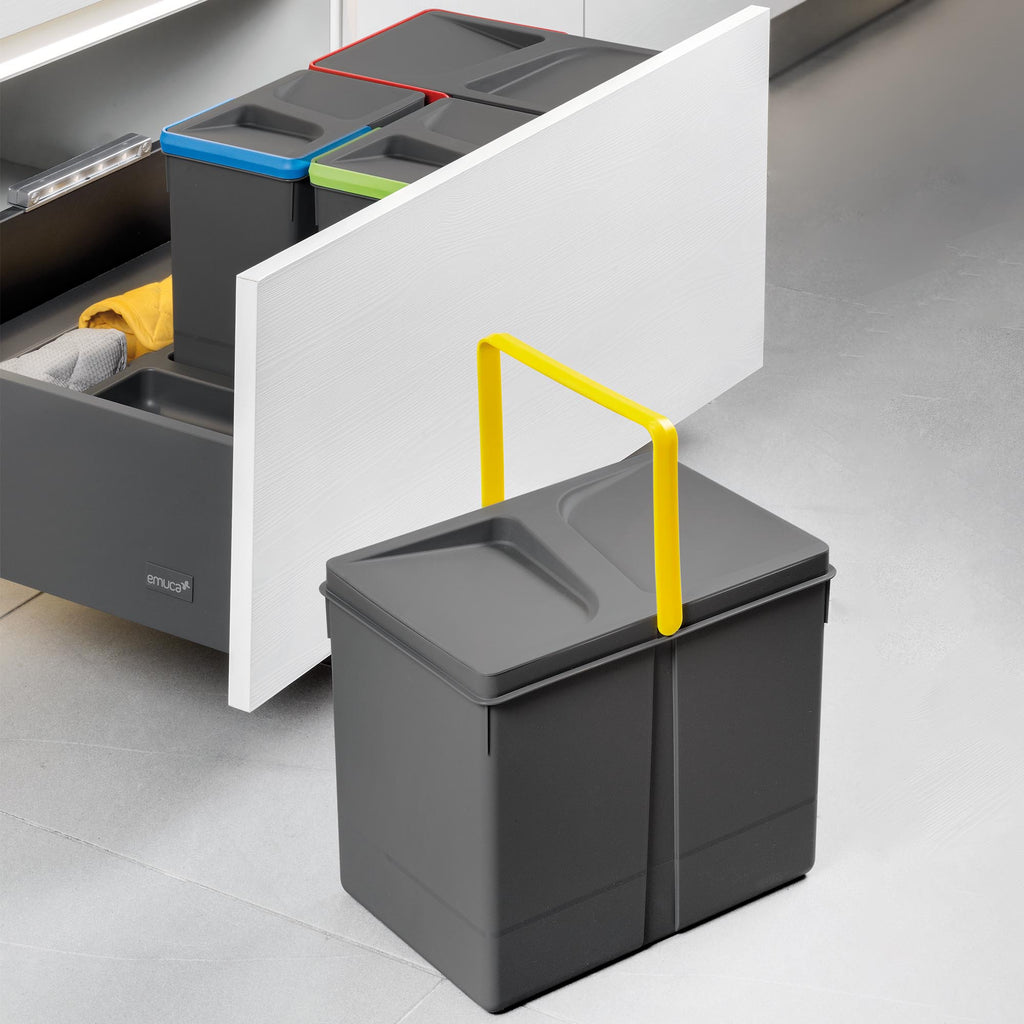 I contenitori per cassetti Recycle di Emuca facilitano la raccolta differenziata dei rifiut i in modo discreto e ordinato, in quanto integrati nei mobili della cucina.