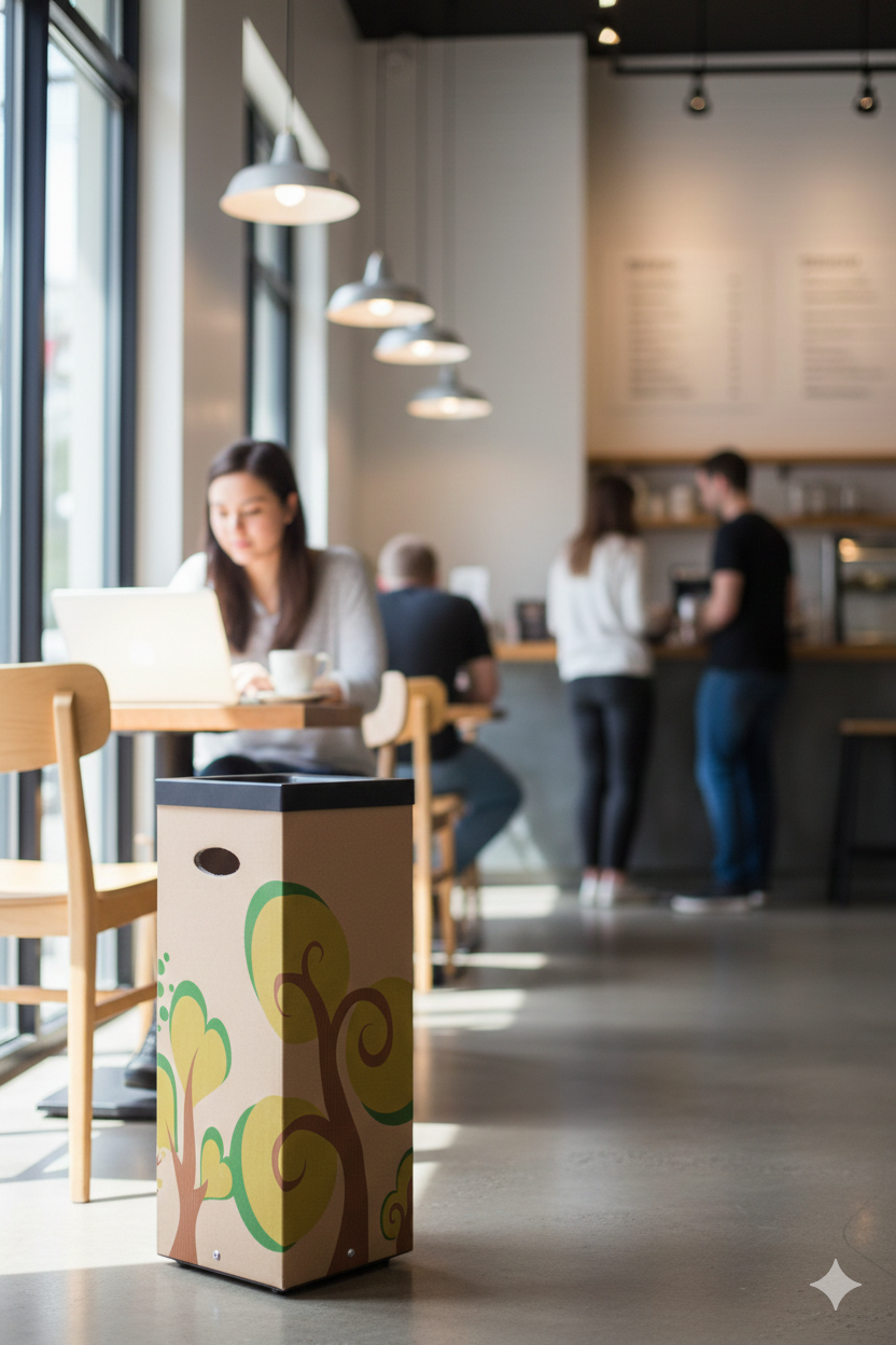 Contenitore per raccolta rifiuti realizzato in cartone 70% riciclato, spessore 7 mm. Stampa digitale realizzata direttamente sul materiale, grafica astratta codice "G2". Cover superiore in plastica nera 100% riciclata. Kit quattro adesivi colorati incluso per differenziare la raccolta. Fondo in metallo verniciato nero. Piedi in gomma antigraffio. Articolo venduto smontato, dotato di istruzioni