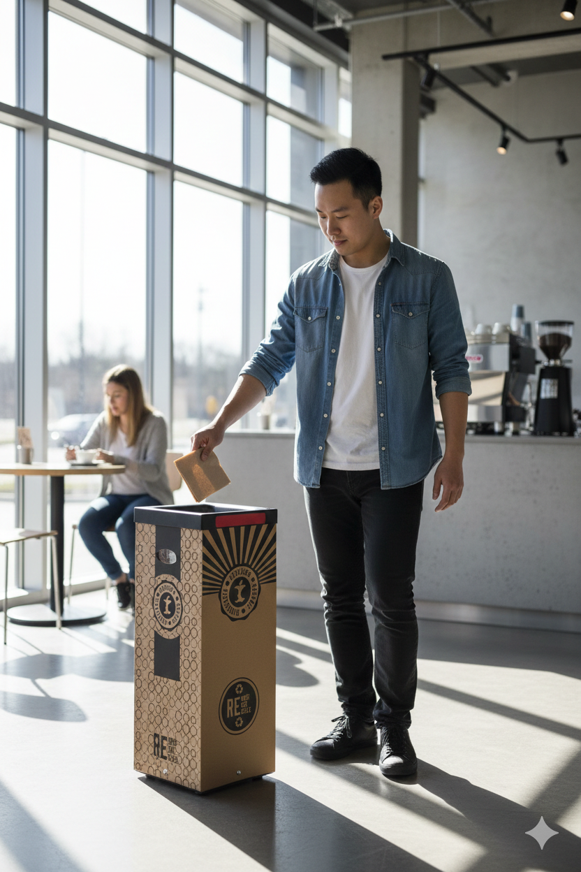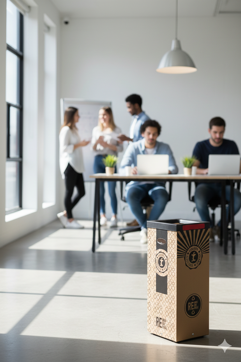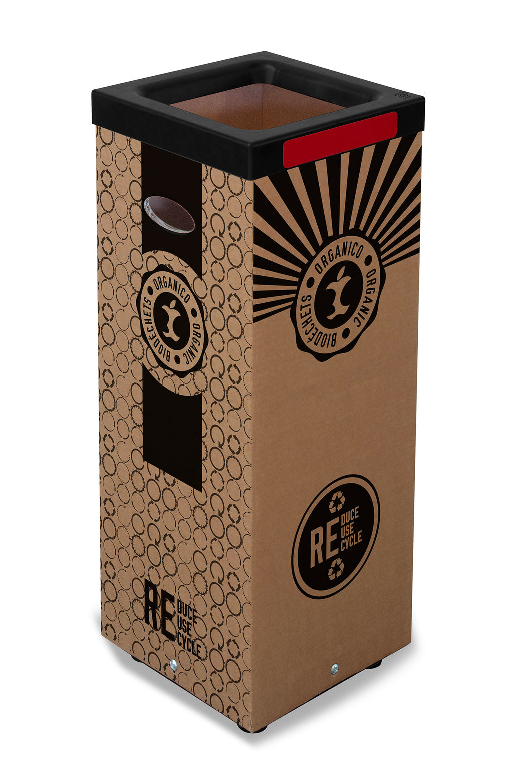 Contenitore per raccolta rifiuti realizzato in cartone 70% riciclato, spessore 7 mm. Stampa digitale realizzata direttamente sul materiale, grafica "organico". Cover superiore in plastica nera 100% riciclata. Kit quattro adesivi colorati incluso per differenziare la raccolta. Fondo in metallo verniciato nero. Piedi in gomma antigraffio. Articolo venduto smontato, dotato di istruzioni