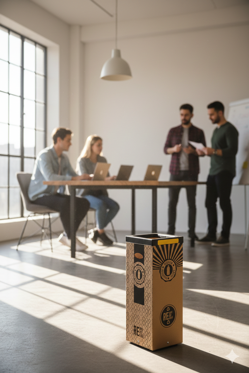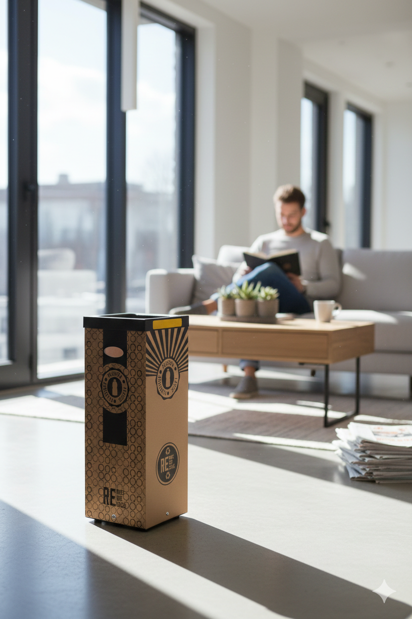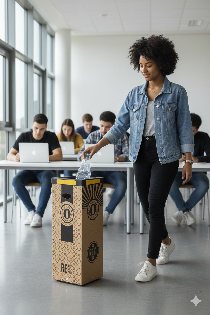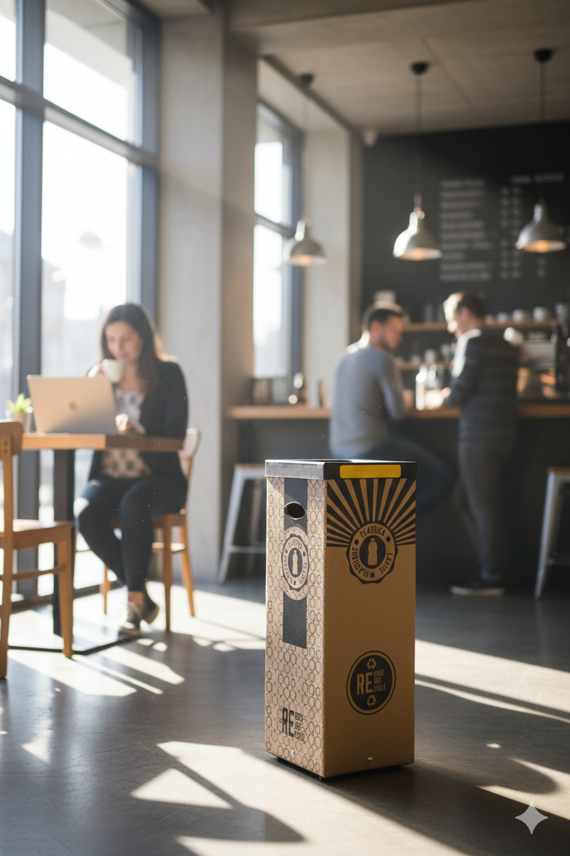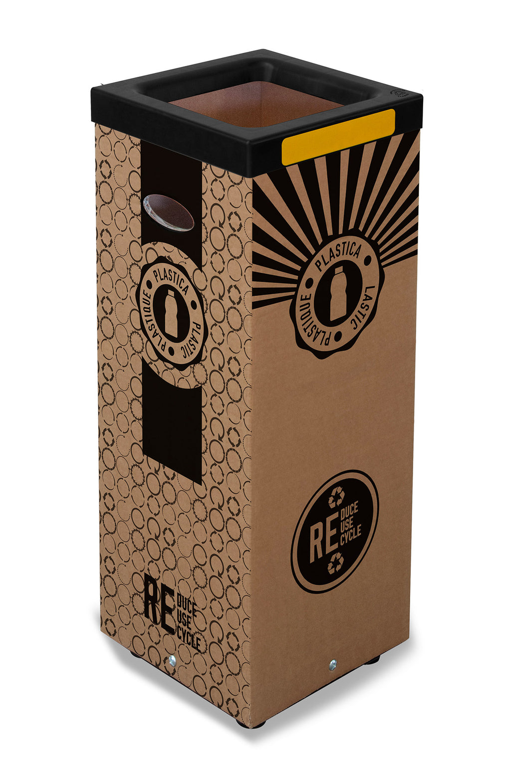 Contenitore per raccolta rifiuti realizzato in cartone 70% riciclato, spessore 7 mm. Stampa digitale realizzata direttamente sul materiale, grafica "plastica". Cover superiore in plastica nera 100% riciclata. Kit quattro adesivi colorati incluso per differenziare la raccolta. Fondo in metallo verniciato nero. Piedi in gomma antigraffio. Articolo venduto smontato, dotato di istruzioni
