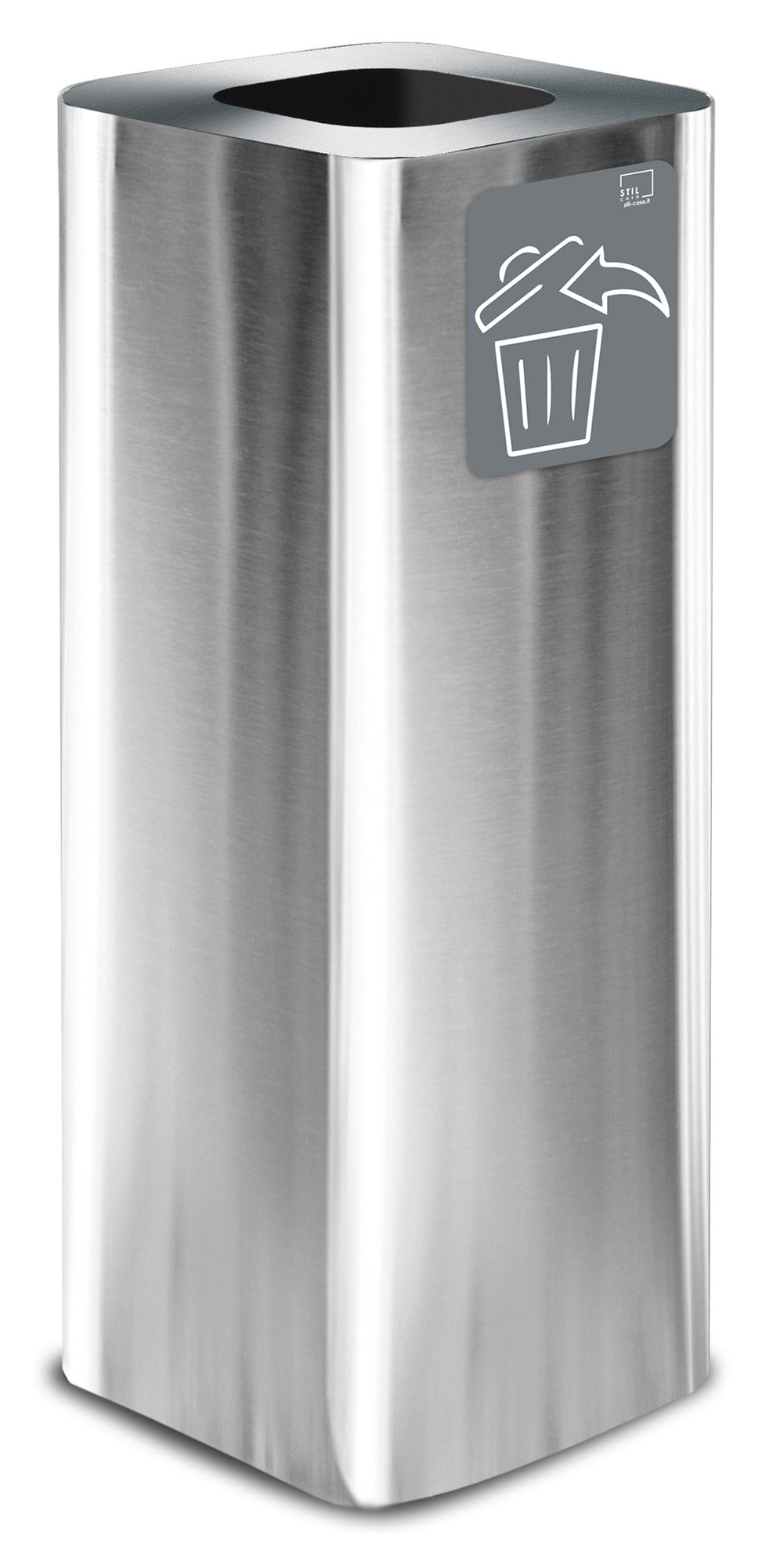 Elegante e funzionale contenitore, per raccolta rifiuti da interno, realizzato totalmente in acciaio inox satinato. Cover in alluminio composito con effetto satinato. Inserimento sacchetto tramite anello perimetrale in tecnopolimero con funzione blocca sacco e tondino zincato ad incastro. Pittogramma magnetico incluso simbolo "indifferenziato", facile da apporre sul lato frontale del contenitore e da rimuovere per consentire un'accurata pulizia del prodotto. Piedini salva pavimento inferiori in tecnopolimero