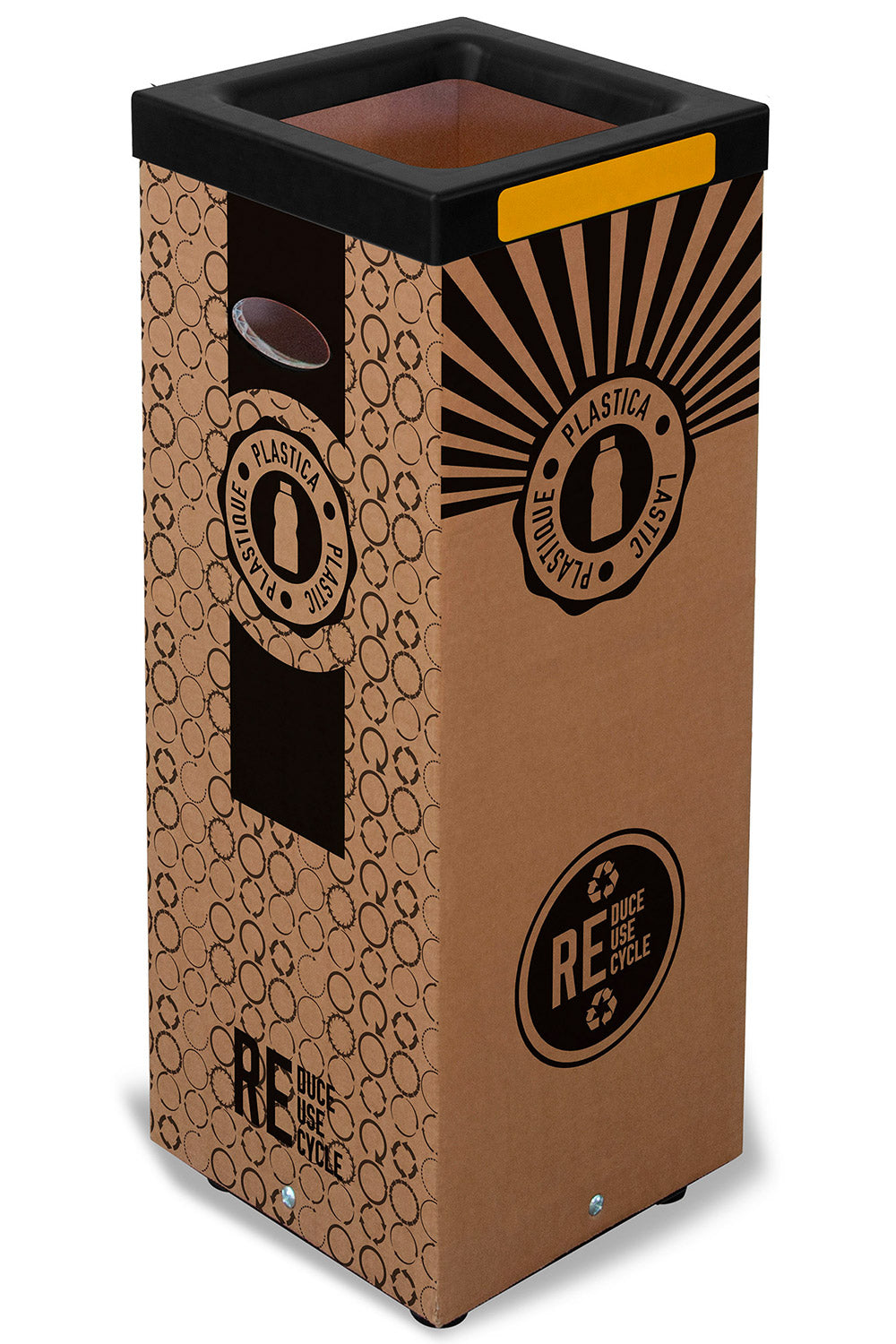 Contenitore per raccolta rifiuti realizzato in cartone 70% riciclato, spessore 7 mm. Stampa digitale realizzata direttamente sul materiale, grafica "plastica". Cover superiore in plastica nera 100% riciclata. Kit quattro adesivi colorati incluso per differenziare la raccolta. Fondo in metallo verniciato nero. Piedi in gomma antigraffio. Articolo venduto smontato, dotato di istruzioni
