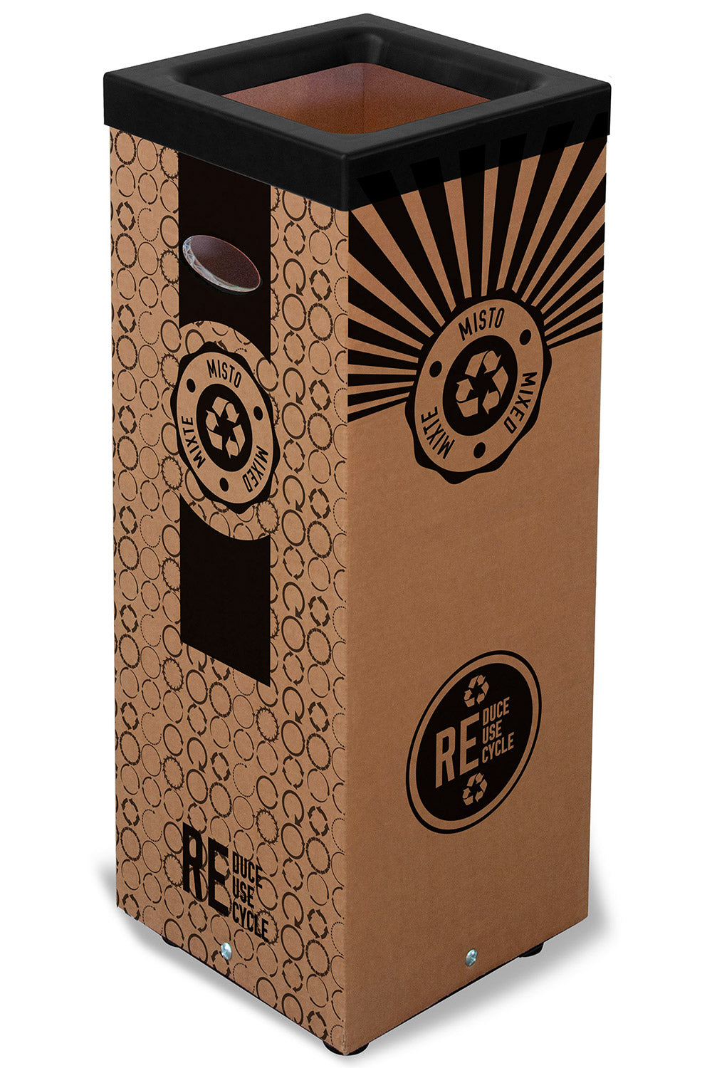 Contenitore per raccolta rifiuti realizzato in cartone 70% riciclato, spessore 7 mm. Stampa digitale realizzata direttamente sul materiale, grafica "misto". Cover superiore in plastica nera 100% riciclata. Kit quattro adesivi colorati incluso per differenziare la raccolta. Fondo in metallo verniciato nero. Piedi in gomma antigraffio. Articolo venduto smontato, dotato di istruzioni