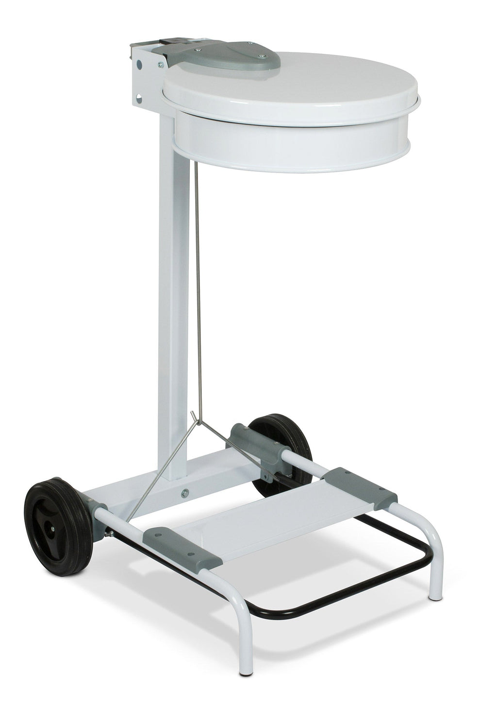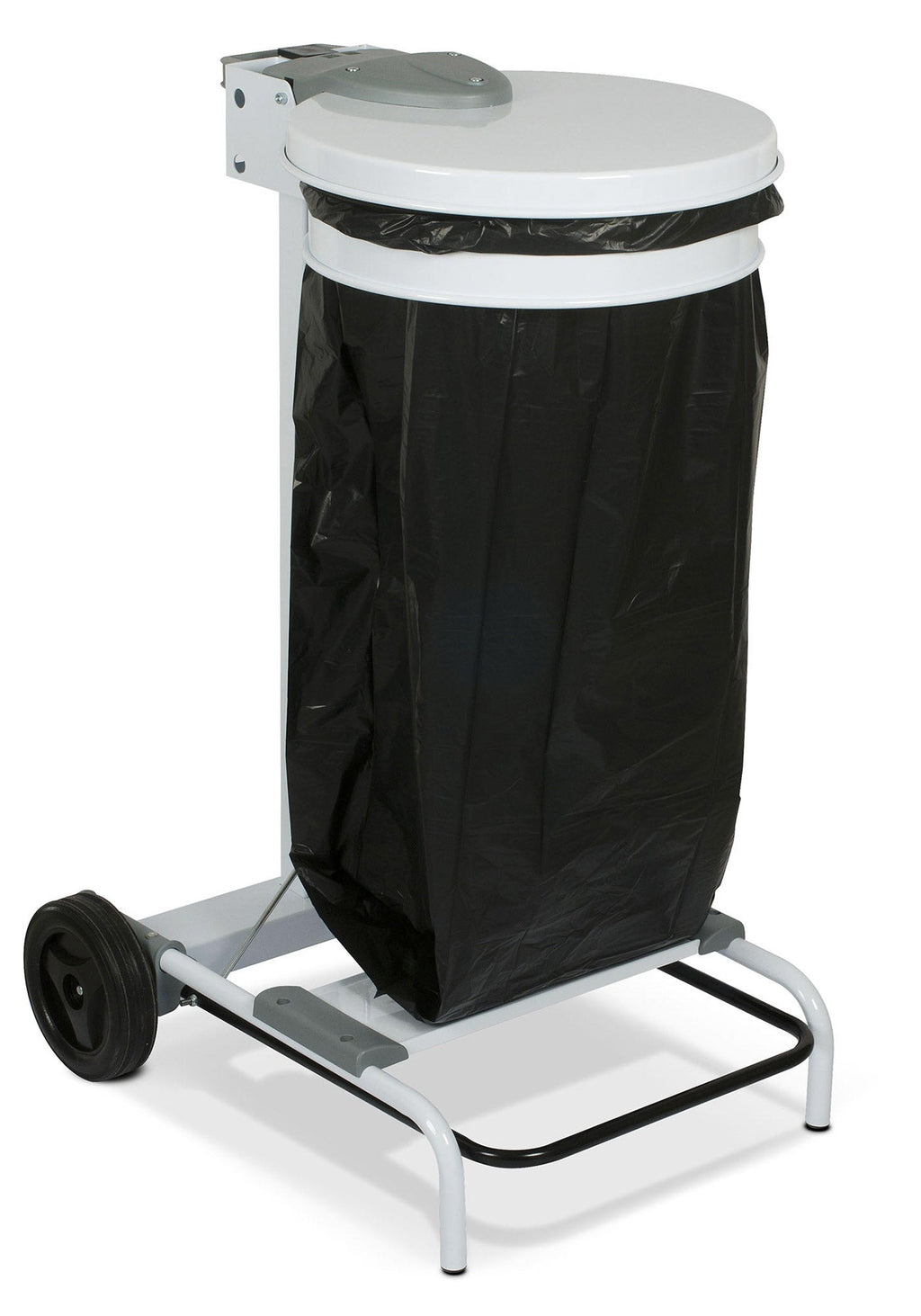 Elegante e funzionale reggisacco per raccolta rifiuti da interno, realizzato totalmente in acciaio verniciato bianco. Coperchio con apertura a pedale. Inserimento sacchetto tramite elastico ferma sacco. Maniglia posteriore in tecnopolimero per agevolare lo spostamento. Due ruote fisse posteriori. Articolo venduto smontato, dotato di istruzioni