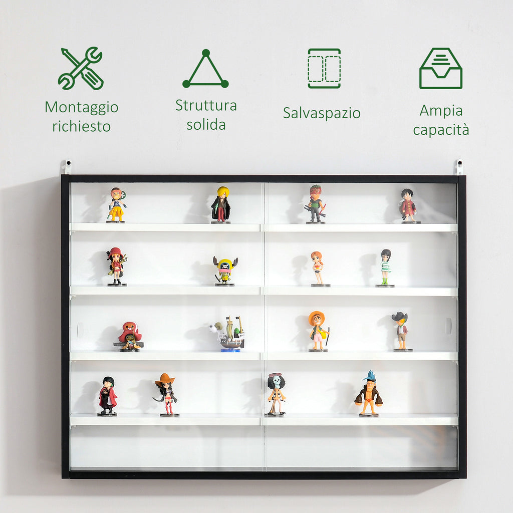 Hai bisogno di dare una casa ai tuoi oggetti da collezione? Con la bacheca portaoggetti hai lo spazio giusto. Il design a 5 ripiani ti permette di posizionare tutto in modo ordinato e puoi regolare le mensole per riporre oggetti di diverse dimensioni. La struttura in legno truciolare rende la vetrina a muro resistente e le ante in vetro scorrevoli ti permettono di accedere facilmente all'interno tenendo protetti i tuoi oggetti.
