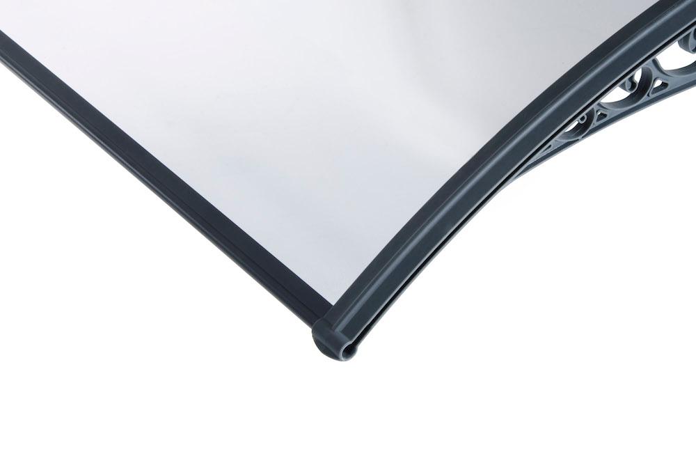 Pensilina con braccetti in polipropilene rinforzato, profili in alluminio sia sulla parte frontale che sul retro. La copertura in policarbonato compatto ha un aspetto liscio. Modulabile ed estensibile lateralmente. Colore struttura: grigio. Colore copertura: Trasparente.