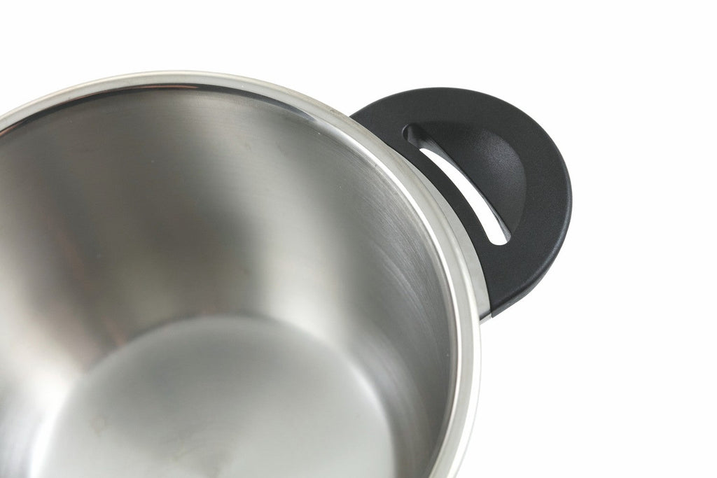Le pentole Mia sono realizzate in acciaio robusto e resistente, il fondo a tripla capsula, consente una diffusione uniforme del calore che facilita i processi di cottura ed esalta il sapore degli alimenti.