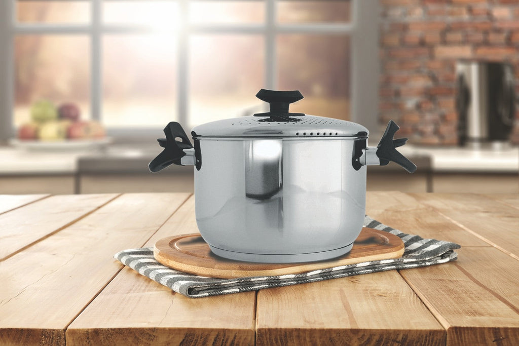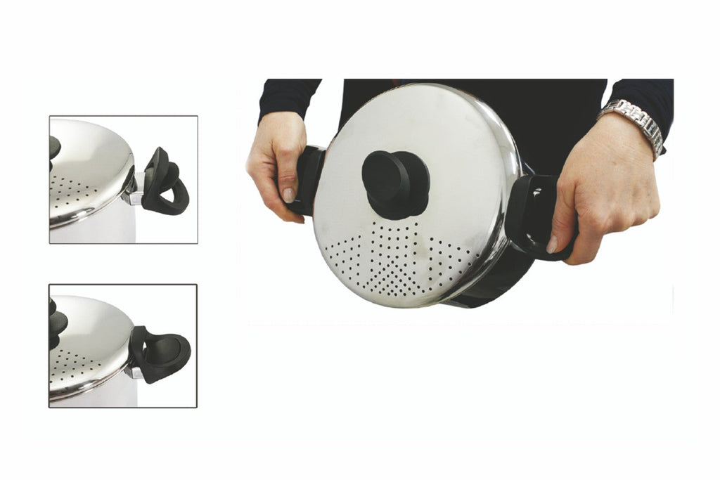 Pasta pot è caratterizzata da un coperchio con micro fori e due manici in bakelite autobloccanti che finalmente faciliteranno la fase di scolatura dell'acqua.