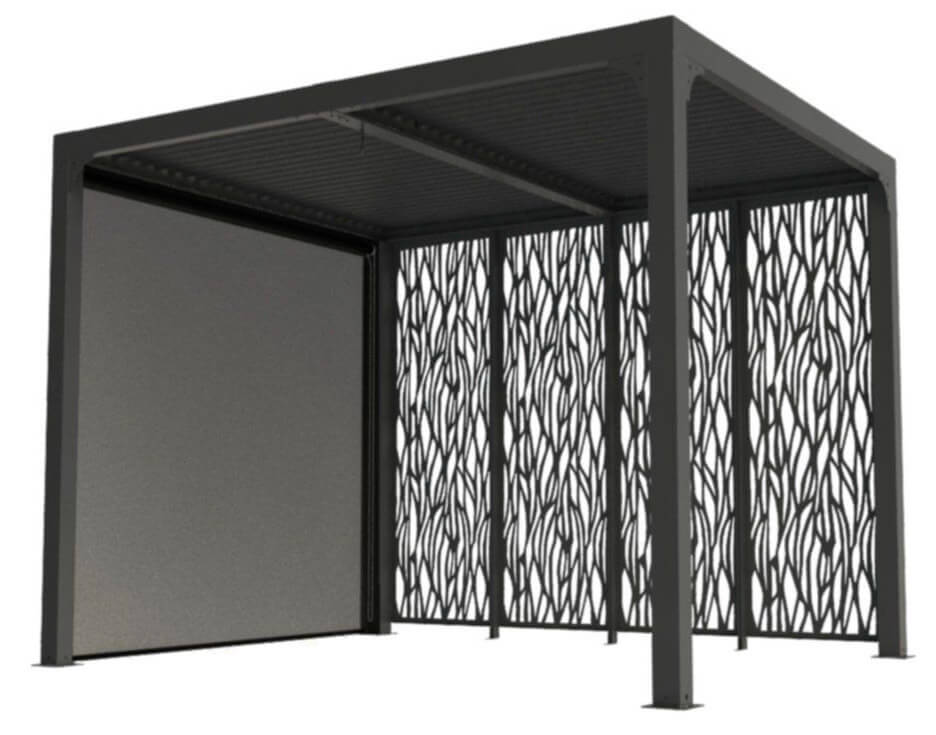 - Copertura: pannelli in alluminio 90 mm, spessore 1mm, colore grigio antracite, orientabili fino a 90°