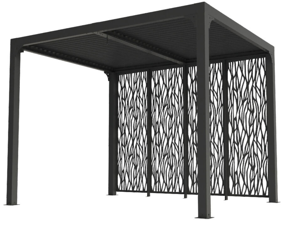 - Copertura: pannelli in alluminio 90 mm, spessore 1mm, colore grigio antracite, orientabili fino a 90°