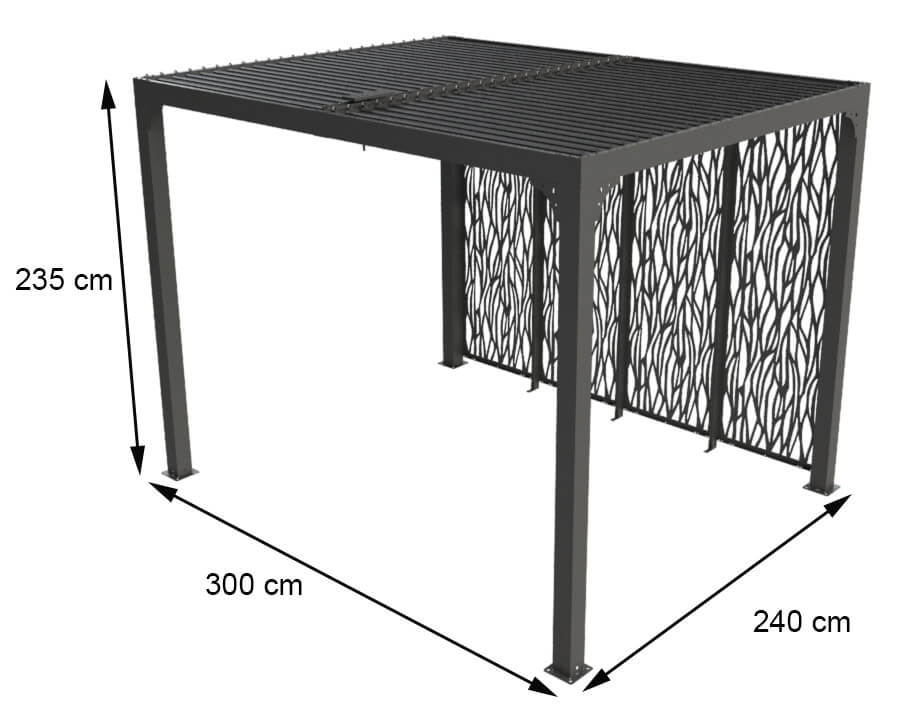Questa pergola consente di coprire uno spazio di 7,20 m2 per la sua dimensione di 2,4x3 m composto da 52 doghe, inclinabile a 90° dal suo meccanismo di apertura e chiusura a manovella, hai un'ampia scelta di sole o ombra come desideri. Con la sua struttura in alluminio ha pezzi di giunzione in acciaio verniciato a polvere per garantire un supporto ottimale in ogni circostanza. Autoportante, facile da montare, abituale per alternare sole o ombra nelle stagioni calde e proteggere dai capricci del tempo durante il resto dell'anno, inoltre è dotato di 4 pannelli schermanti moucharabieh. Installati sul lato di 3 metri della pergola bioclimatica, i suoi 4 pannelli, veri schermi in acciaio verniciato a polvere, offrono un angolo ombreggiante che attenua gli effetti del tonificante sole, e si trasformerebbe, attraverso le eleganti volute traforate che lo compongono, insistenti venti in una leggera ventilazione. Indipendente, impostato con un telaio, avvitato a terra, realizzato in un acciaio da 1 mm molto resistente, ogni pannello e palo è verniciato a polvere, offrendo protezione visiva resistendo al vento e ad altri urti. Le sue complete e dettagliate istruzioni di montaggio confermeranno la vostra scelta e faciliteranno l'installazione di questa pergola.