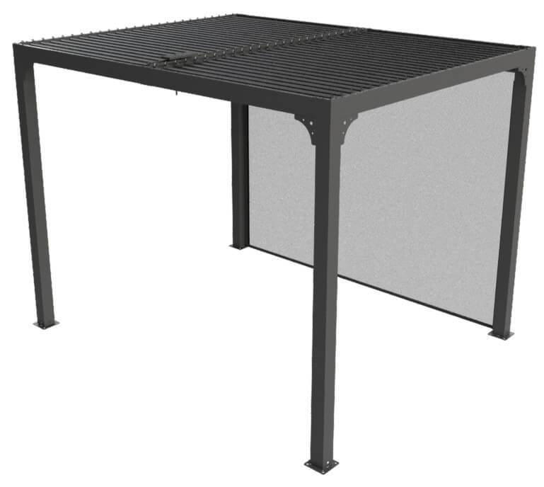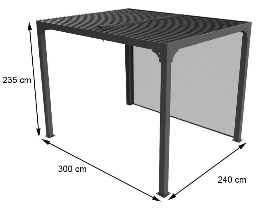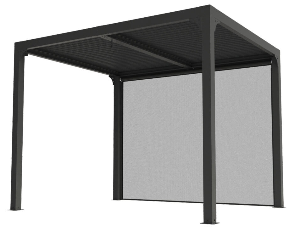 Questa pergola è adatto ad una zona relax ottimizzata per proteggersi dal sole estivo, lasciando entrare la luce e il caldo dell'inverno. Per l'ottimizzazione del vostro comfort, la pergola bioclimatica è dotata di una tenda laterale realizzata in PVC intrecciato semplice da srotolare manualmente, permette di regolare l'altezza della tapparella in base alle proprie esigenze. Il suo sistema di guida laterale fissato ai montanti opposti della pergola ne rafforza la resistenza alle variazioni di correnti d'aria garantendo un perfetto scorrimento verticale. Facile da montare sulla facciata di 3 metri del tuo pergolato, si adatterà perfettamente ai tuoi desideri di pace e tranquillità di fronte al vento, al sole e ad occhi indiscreti.