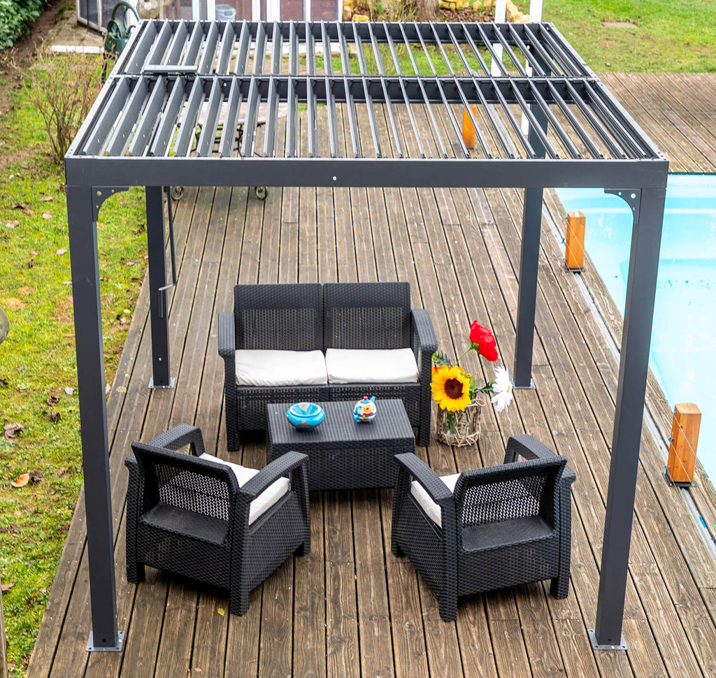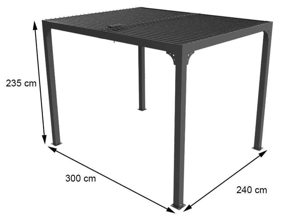 Pergola autoportante, composta da 4 robusti montanti dotati di 2 arcarecci laterali e 2 arcarecci anteriori, sormontati da 52 listelli armati di un sistema di apertura e chiusura a manovella Linea pulita, montanti 10x10 cm, struttura in alluminio verniciato a polvere, design meticoloso, offrono un'estetica contemporanea che ben si sposa con qualsiasi tipo di abitazione. La struttura in alluminio, accoppiata a pezzi di giunzione e il meccanismo di posizionamento in acciaio, sono stati progettati per resistere ai capricci del tempo e ai cambi di stagione. Le dimensioni di 2,4 x 3 metri offrono un'ampia scelta di installazione in giardino, sul terrazzo, sul balcone, a bordo piscina, per proteggere alla vista una zona pranzo, una spa o una vasca idromassaggio , più semplicemente per permettersi una zona relax. Accostato al bovindo di un soggiorno, permette, chiudendo le sue feritoie di ridurre l'impatto del sole per l'apertura dello stesso, di creare una ventilazione naturale, evitando l'effetto serra durante il caldo forte e dall'apertura totale di queste per mantenere il luce all'interno della stanza, soprattutto in inverno. Noto per la sua longevità e la sua resistenza alle intemperie, l'alluminio che ne compone la struttura è pegno di un investimento a lungo termine, abbinato a una garanzia di 5 anni. Sviluppato per offrire un allestimento semplice, grazie alle sue istruzioni dettagliate e alle parti numerate, avrai un pergolato bioclimatico che ti permetterà di giocare con i capricci del sole, per goderti una rilassante atmosfera estiva a pranzo.