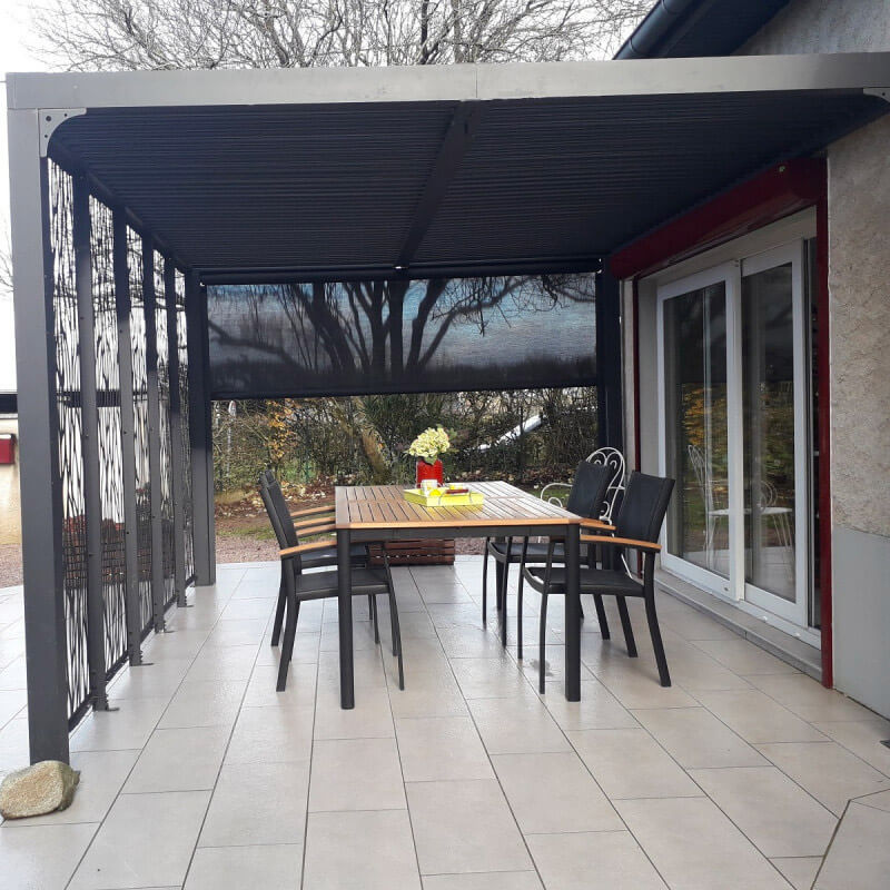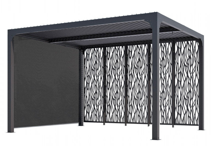 La pergola autoportante, è composta da una struttura e 78 pannelli parasole girevoli, non motorizzati, in alluminio 100%, verniciato a polvere. Tutti i pannelli sono ripartiti in 2 parti separate, offrendo la possibilità di apertura a 90°, per aprire e chiudere, con un solo gesto, i 2 lati, a seconda dell'intensità della luce desiderata. In posizione chiusa, il tetto offre protezione in caso di pioggia, con il suo sistema di trasferimento dell'acqua alle grondaie poste negli importi laterali. Posizionata sul lato 3m è dotata di una Tenda avvolgibile manualmente molto semplice da montare grazie alle sue istruzioni dettagliate ed alle sue parti numerate, mentre sul lato 3,6m sono posizionati 5 pannelli mashrabiyya, costituiscono un dispositivo di ventilazione forzata naturale, (usato nell'architettura tradizionale dei Paesi arabi per accelerare il passaggio del vento). I pannelli mashrabiyya, in acciaio epoxy spessore 1mm, ognuno indipendente, sono termolaccato con il palo di fissaggio, hanno superficie piana traforata a forme vegetali, su una cornice di 2,50m, molto resistente e durevole. Molto semplice da montare grazie alle sue istruzioni dettagliate e alle sue parti numerate.