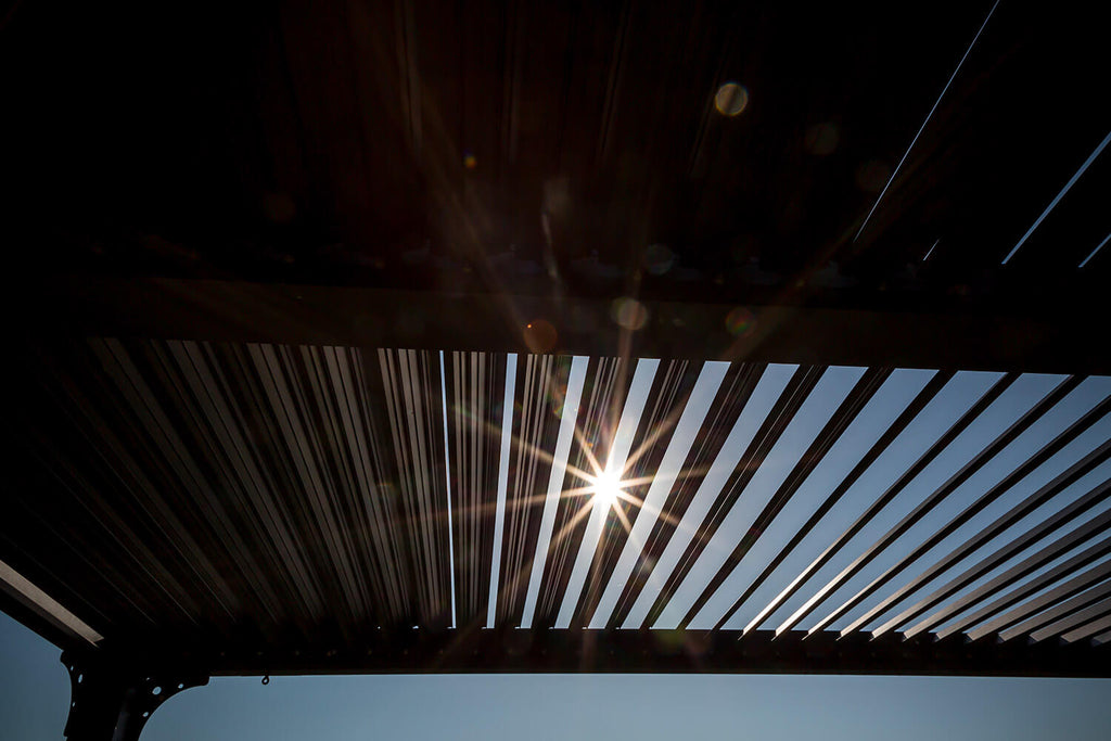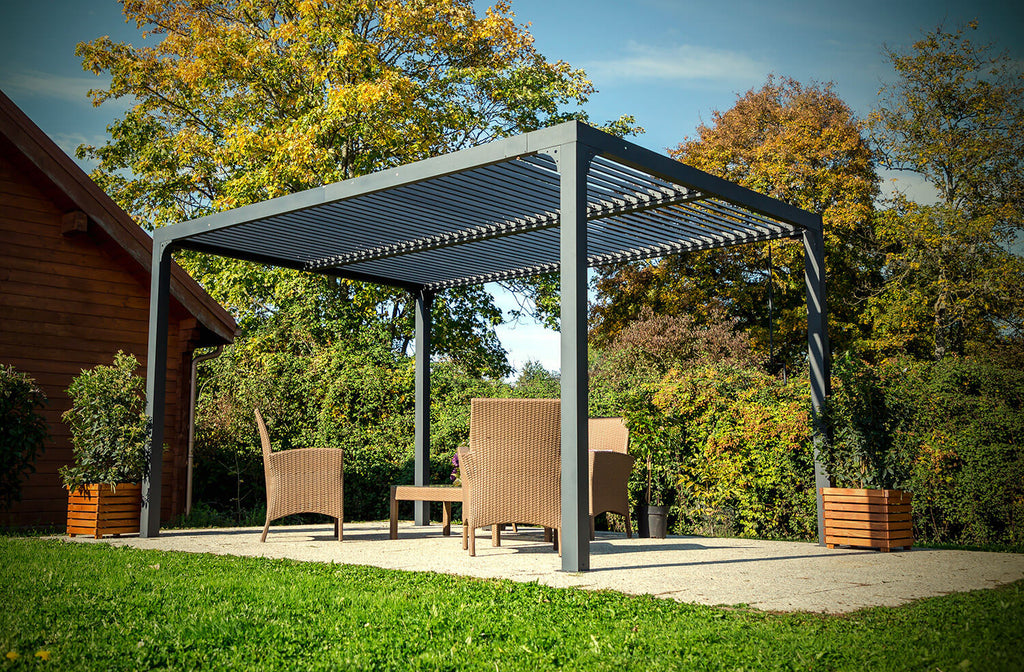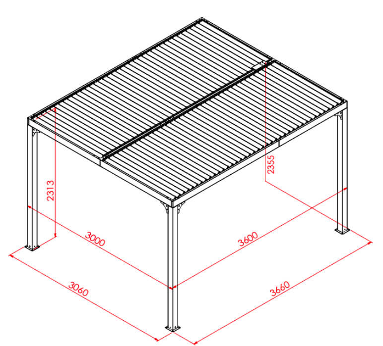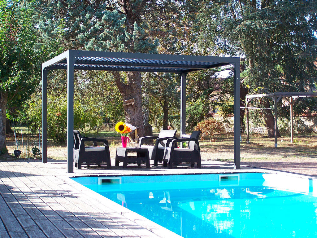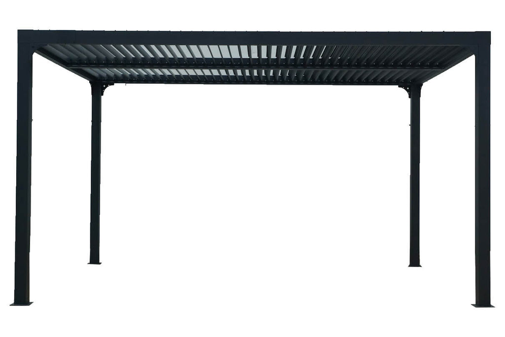 La pergola autoportante, è composta da una struttura e 78 pannelli parasole girevoli, non motorizzati, in alluminio 100%, verniciato a polvere. Tutti i pannelli sono ripartiti in 2 parti separate, offrendo la possibilità di apertura a 90°, per aprire e chiudere, con un solo gesto, i 2 lati, a seconda dell'intensità della luce desiderata. In posizione chiusa, il tetto offre protezione in caso di pioggia, con il suo sistema di trasferimento dell'acqua alle grondaie poste negli importi laterali. Molto semplice da montare grazie alle sue istruzioni dettagliate ed alle sue parti numerate.