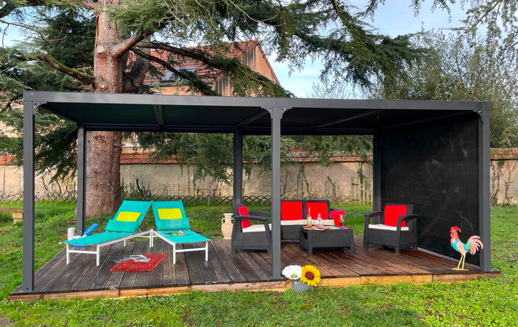 La pergola bioclimatica offre alle persone con un zona relax ottimizzata, per proteggersi dal sole estivo, offrendo la possibilità di far entrare luce e calore durante mesi invernali. Per ottimizzare il vostro comfort, è dotata di una tenda laterale per uno dei lati di 3,60 m.