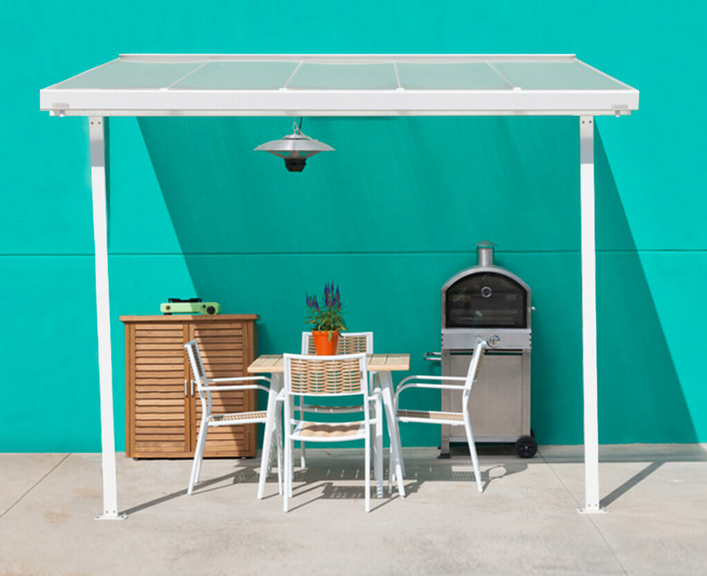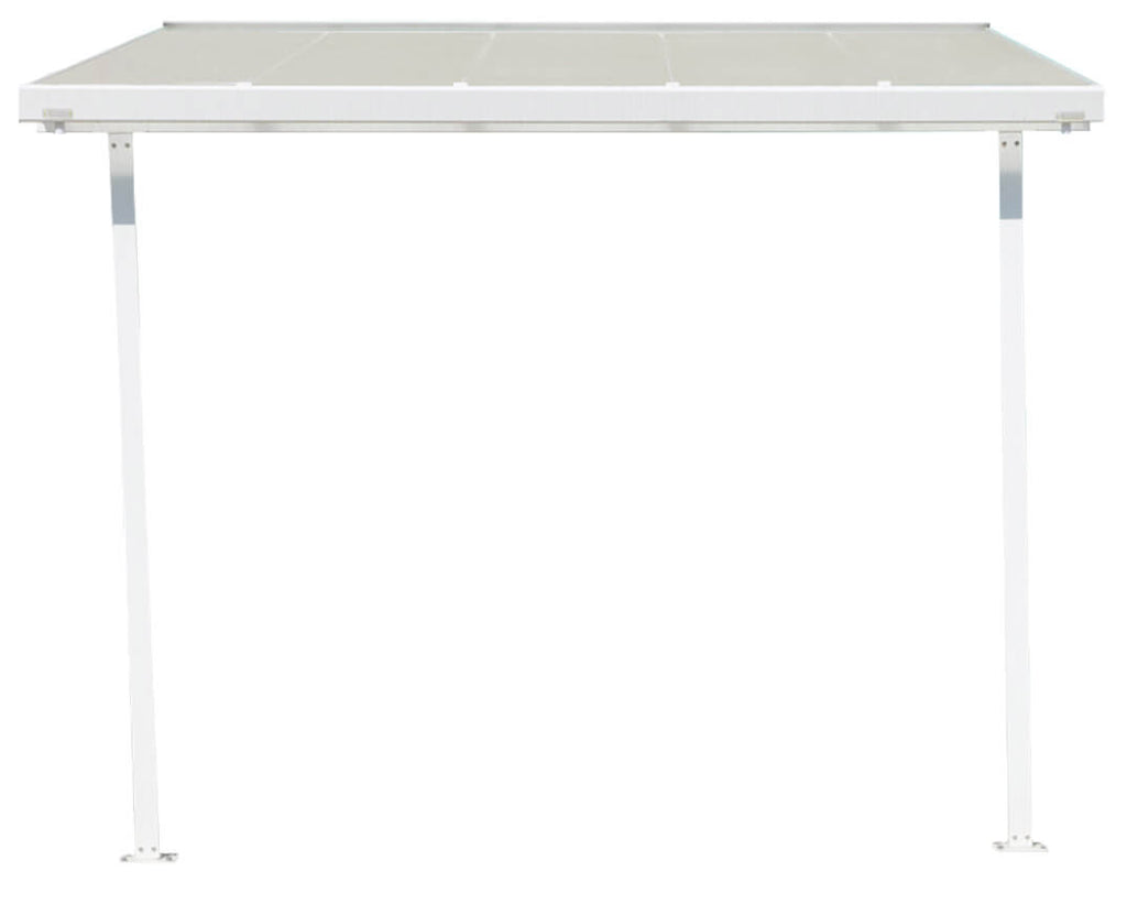 Pergola Tenda da esterno in policarbonato resistente UV con struttura in alluminio bianco da fissare al terreno.