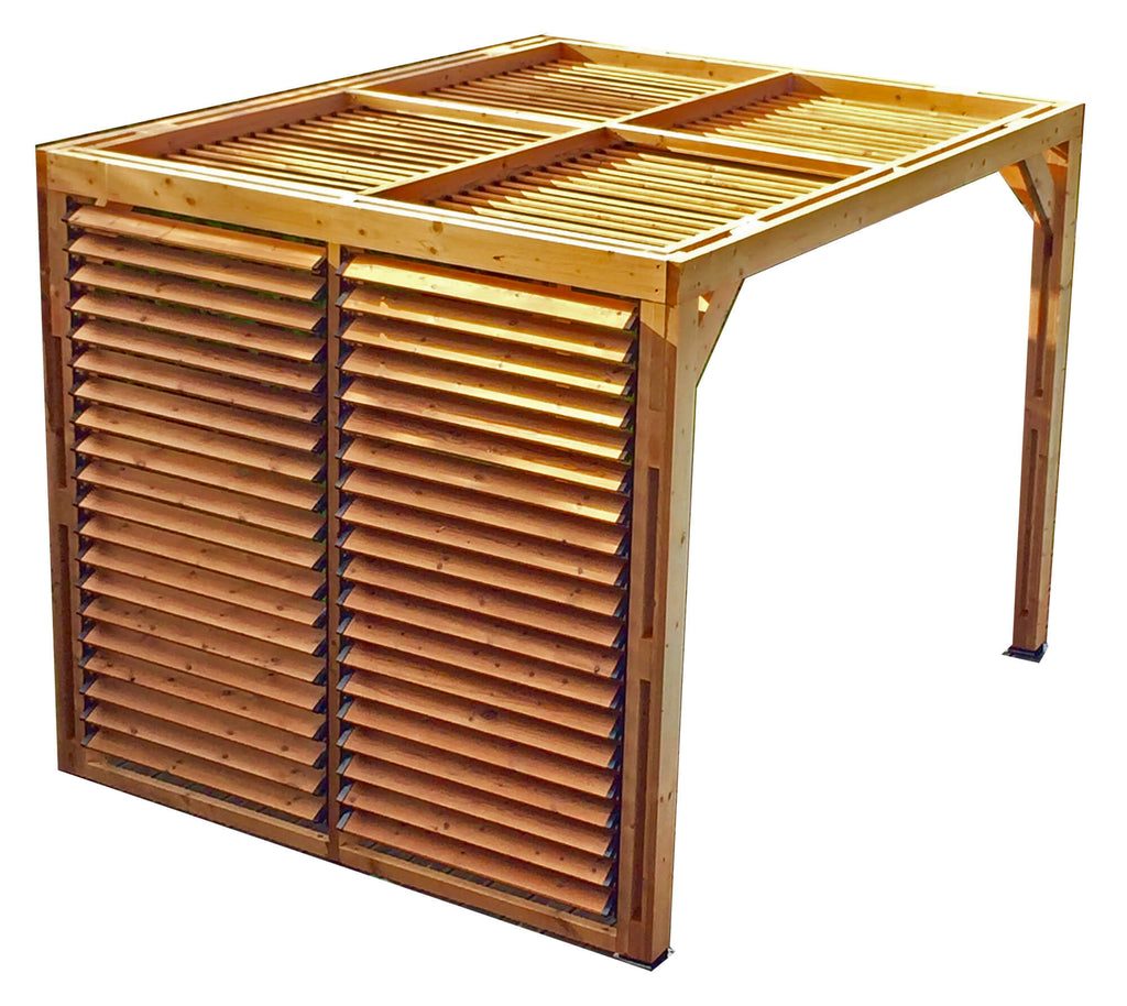 - Copertura: frangivista con stecche orientabili, in legno trattato ad alta temperatura, da fissare tra gli arcarecci