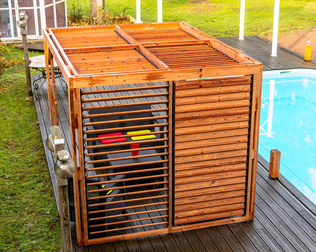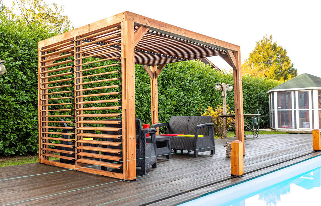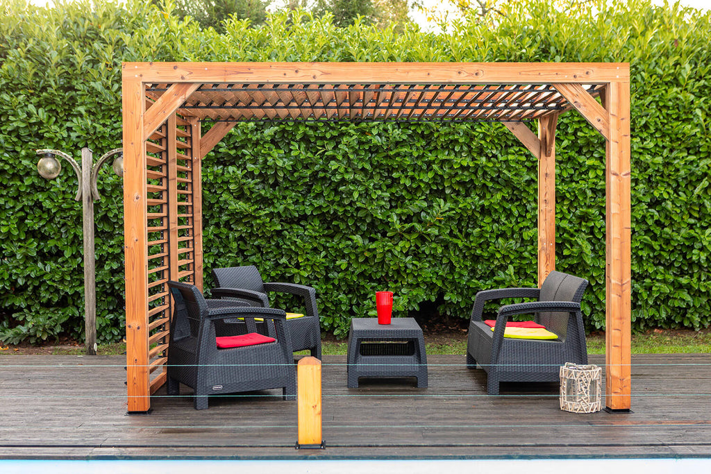 - Parete: una dotata di frangivista con stecche orientabili, in legno trattato ad alta temperatura, da fissare tra i pali