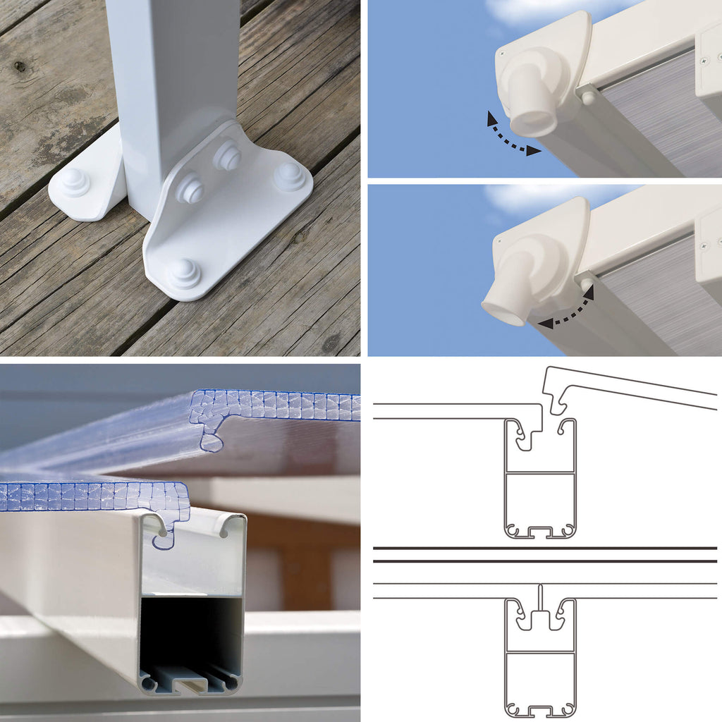 - Il montaggio è estremamente semplice e veloce e non richiede l'utilizzo di strumenti professionali. Sono necessarie soltanto due persone. Gli appoggi a terra regolabili ed adattabili consentono alla pergola EMILIA di adattarsi perfettamente a tutti gli spazi esterni.