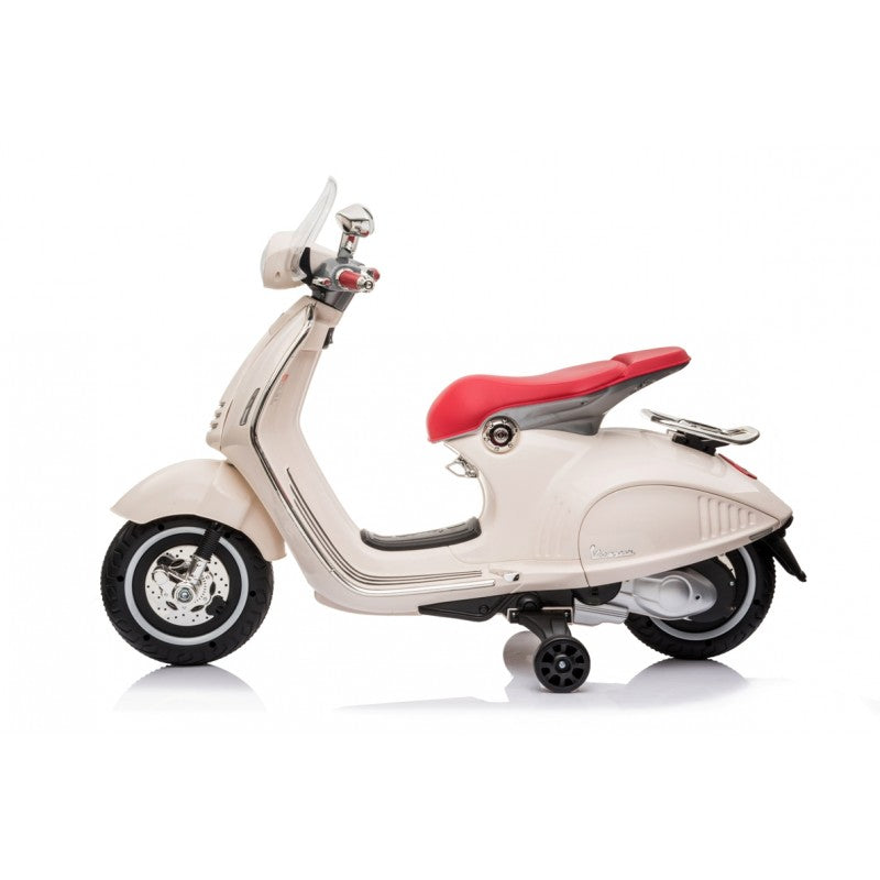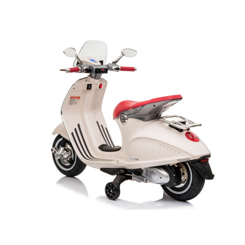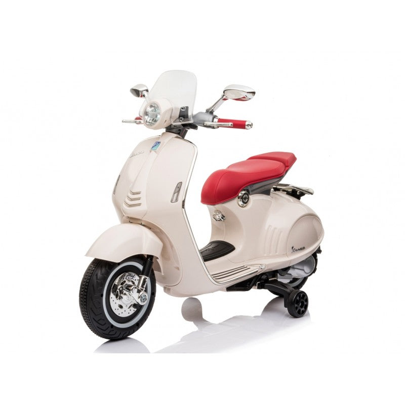Bellissima Moto Elettrica Vespa 946 Piaggio per bambini da 3-6 Anni adatta anche ai Più Piccoli (Con La Stretta Sorveglianza Dei Genitori). Unica Nel Suo Stile Con Due Sensi Di Marcia: Avanti-Indietro, Accelleratore A Pedale, Faro Anteriore Che Si Illumina Con Luci a Led, Suoni Realistici e Diverse Musiche Incorporate. Ottime Rifiniture Cromate, Sedile in similpelle. Batteria e Caricabatterie a 12V inclusi.