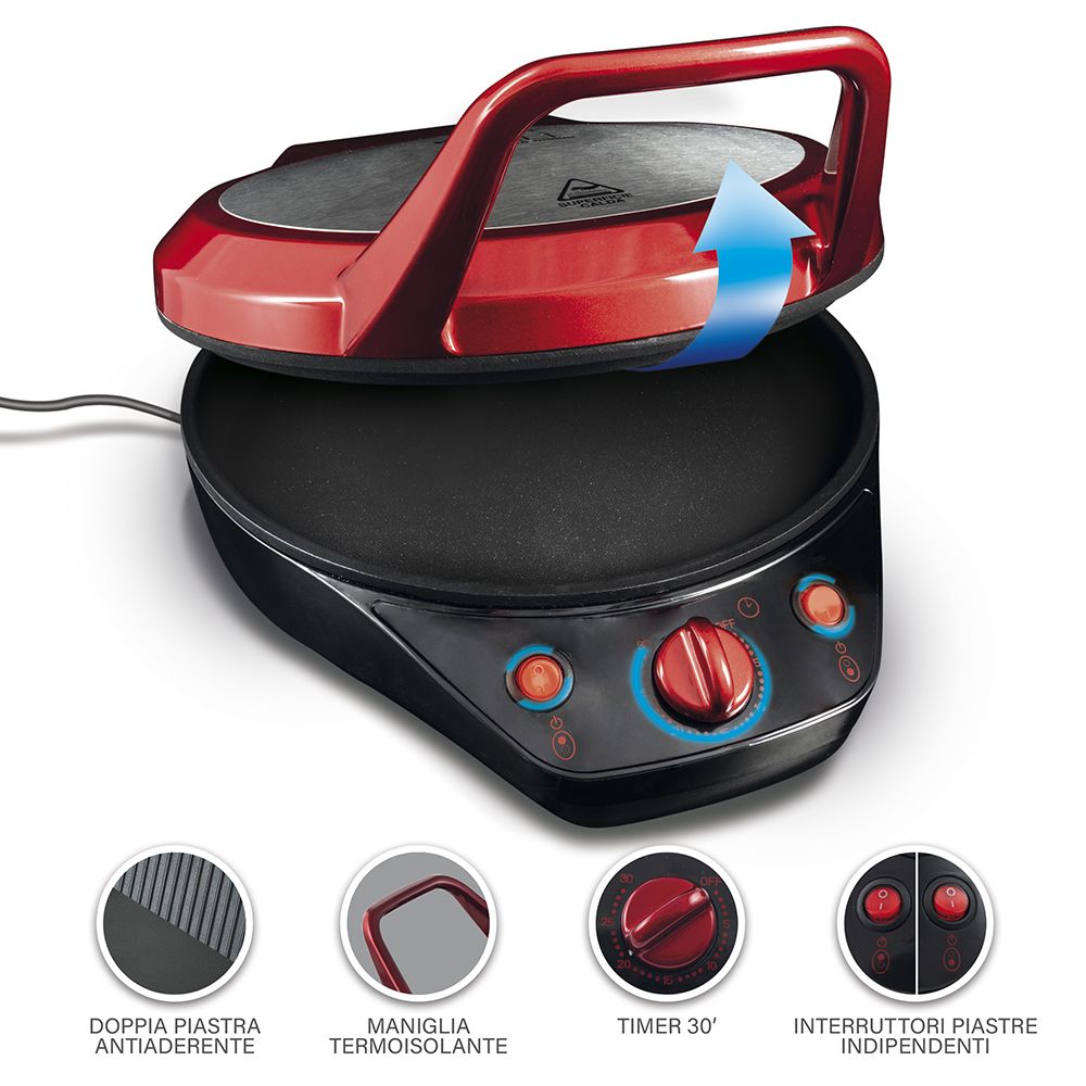 Italì Pizza Maker è dotato di 3 impostazioni di cottura selezionabili e di un timer che suona a fine cottura questo piano cottura è veramente facile da usare, fuori e dentro casa. Il bordo alto della padella aiuta a conservare il succo del cibo, mentre la superficie del grill ha i bordi bassi, così è più facile girare le pietanze. La superficie antiaderente inoltre permette di cucinare con meno grassi, così i piatti saranno deliziosi e più sani. Una volta finito di usarlo, si pulisce semplicemente con un panno, e grazie al suo design compatto può essere portato ovunque.