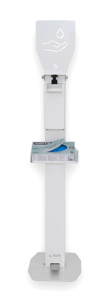 Colonna per dispenser gel igienizzante mani a Pedale da posizionare in centri commerciali, negozi e reception di uffici per consentire la disinfezione delle mani.
