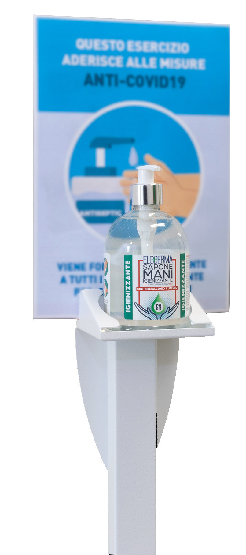 Colonnina per dispenser gel igienizzante mani manuale da posizionare in centri commerciali, negozi e reception di uffici per consentire la disinfezione delle mani.