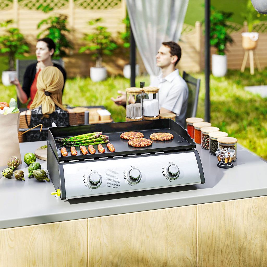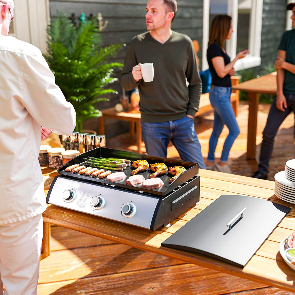 Scopri la piastra barbecue con coperchio, ideale da portare ovunque: perfetta per goderti piatti caldi anche fuori casa. Con tre bruciatori indipendenti, la piastra BBQ a gas offre la possibilità di cucinare tre volte più cibo contemporaneamente. Ogni bruciatore eroga 10000 BTU/7.5kw, garantendo un calore ottimale. La superficie antiaderente della piastra barbecue assicura una cottura e pulizia semplici, ed è presente una vaschetta di raccolta del grasso per una facile manutenzione.
