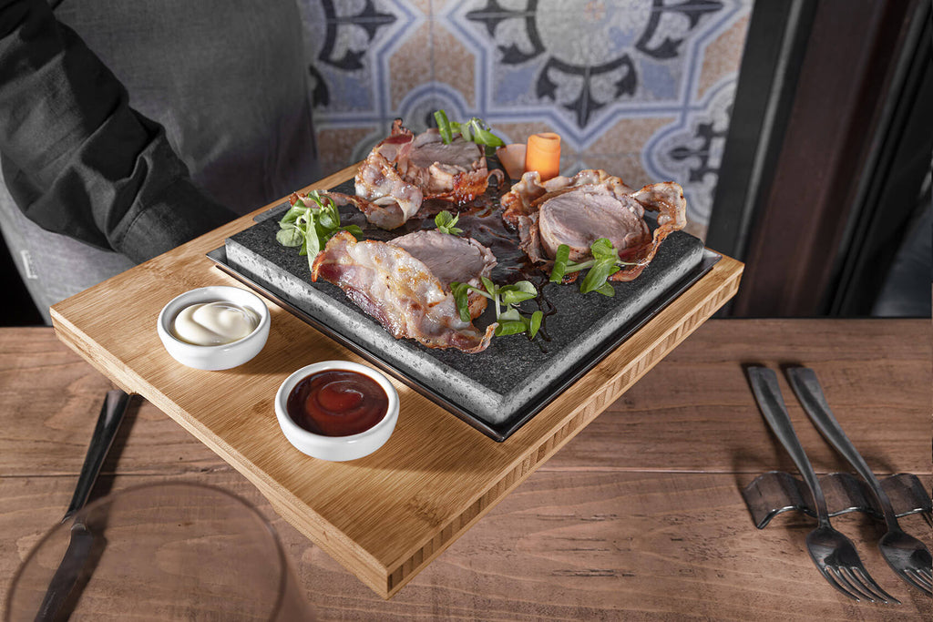 Piastra Pietra Lavica con Ciotole adatta per cucinare direttamente a tavola. Dotata di 1 Vassoio in Alluminio e una Base in Legno di Bamboo. Ideale come centro tavolo max per 2 persone.