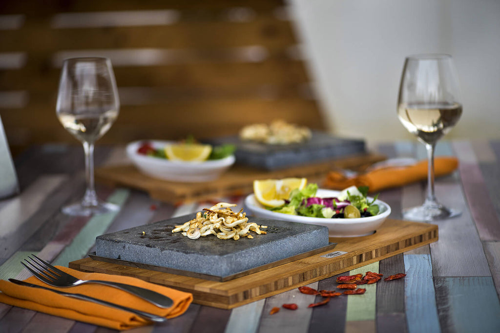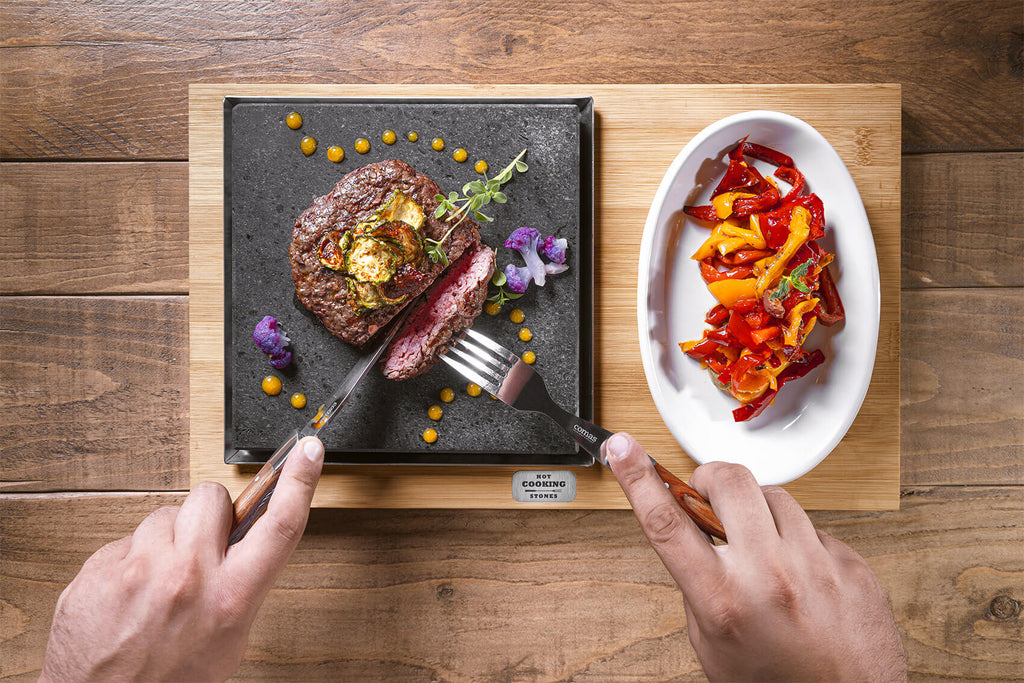 Piastra Pietra Lavica con Insalatiera adatta per cucinare direttamente a tavola. Dotata di 1 Vassoio in Alluminio e una Base in Legno di Bamboo. Ideale come esperienza Singola.