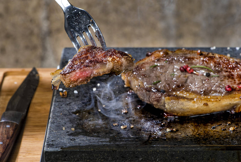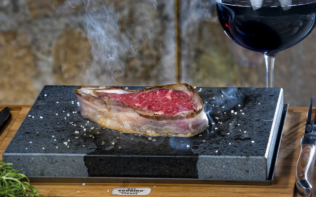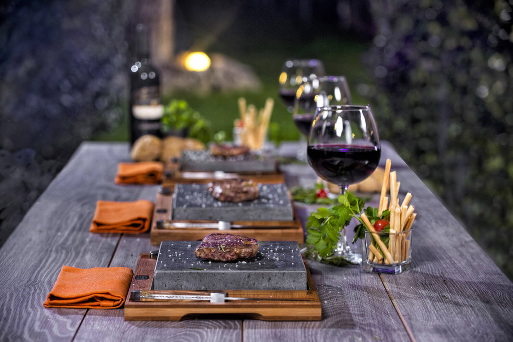 Piastra Pietra Lavica con posate adatta per cucinare direttamente a tavola. Dotata di 1 Vassoio in Alluminio e una Base in Legno di Bamboo. Ideale come esperienza Singola.