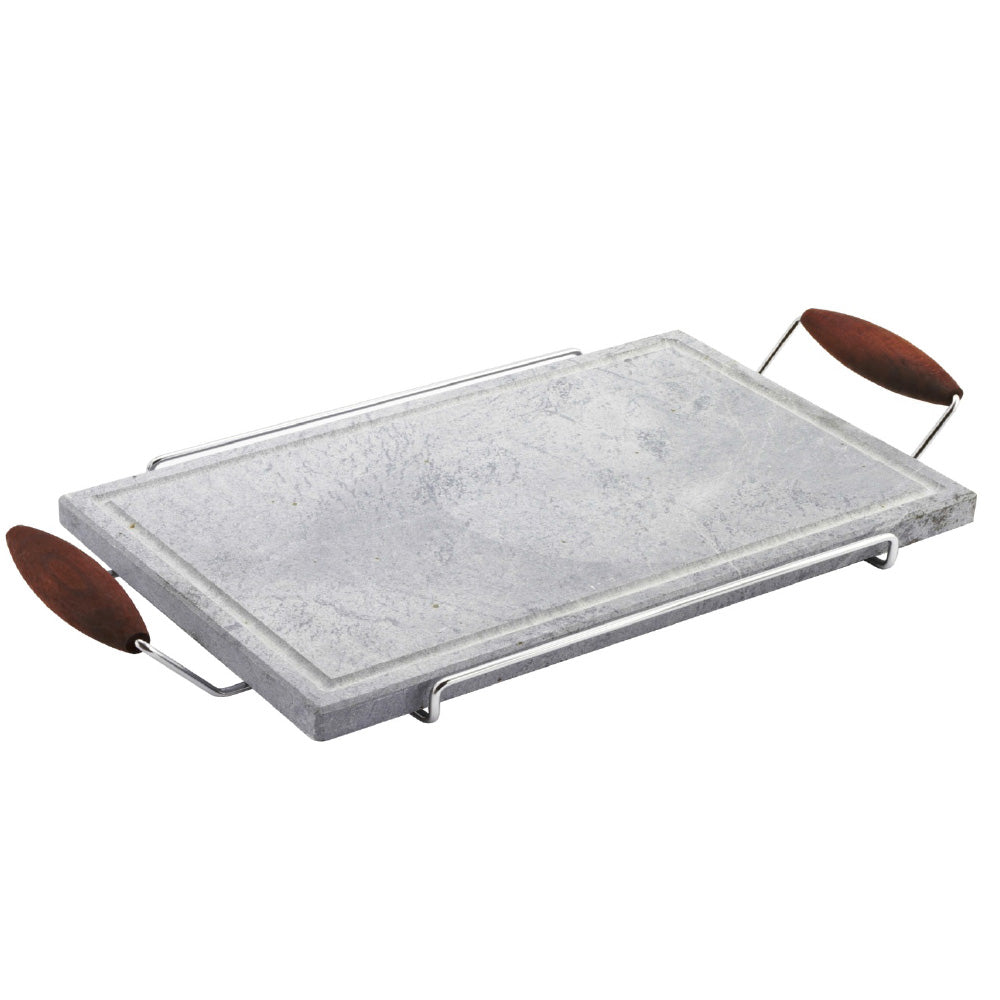 Le piastre in pietra ollare con telaio uniscono la genuinità della cottura su pietra alla pratica struttura in metallo, con manici color wengè, per cucinare e servire le proprie portate con stile e facilità. Sono disponibili in forma rotonda, quadrata e rettangolare, in diversi formati, per adattarsi a tutte le cucine e a tutte le pietanze.