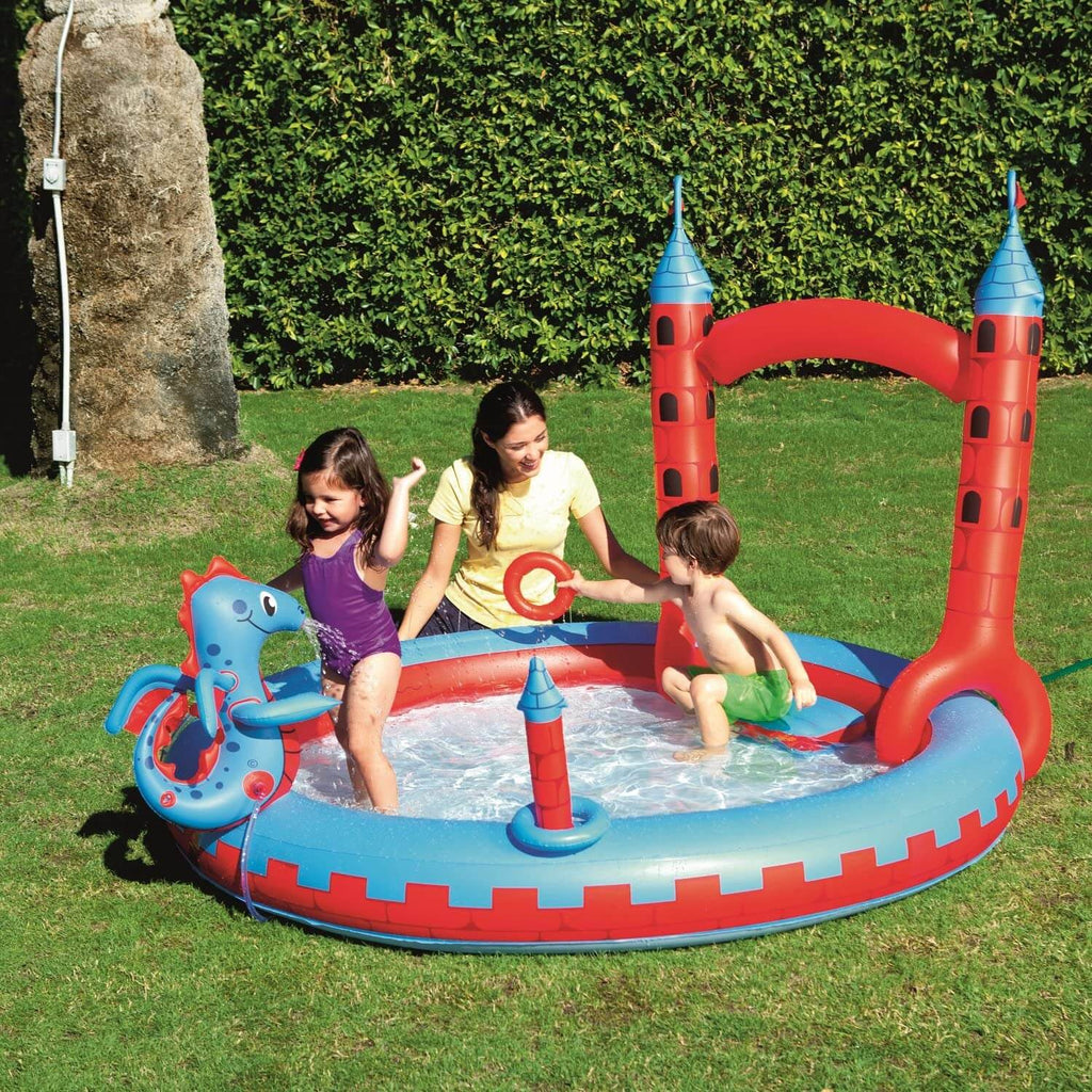 Bestway Piscina Castello Interattiva, è la piscina che i tuoi piccoli stavano aspettando. Realizzata in vinile pretestato. Nella piscina è presente un spruzzatore attivabile con la pressione di un tasto che si trova sul fondo. Munita di Valvola di Sicurezza.