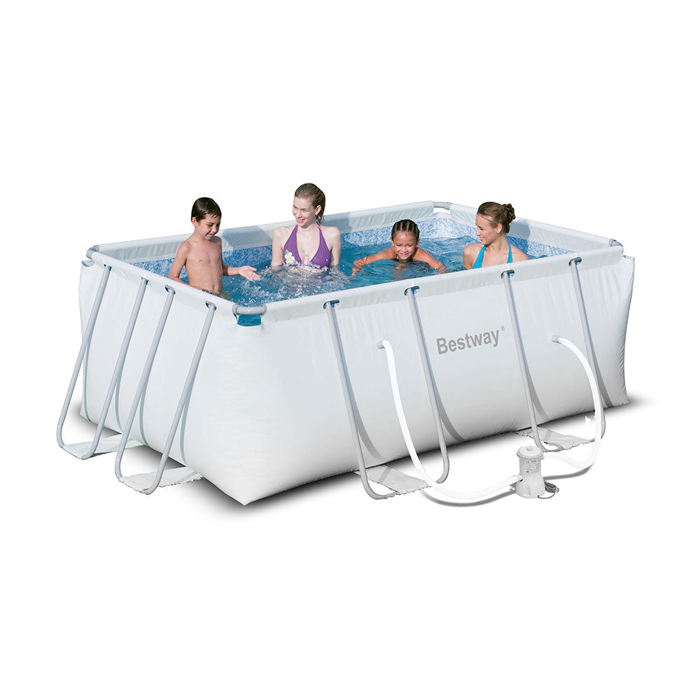 Piscina rettangolare compresa di pompa a filtro 220-240V cm 287 X 201 X h 100 Capacità lt. 4886 (90%) Filtraggio lt. 1250/h Peso imballo Kg 40.6Piscina Fuori Terra Rettangolare H100x287x201cm con Pompa a Filtro Bestway Frame