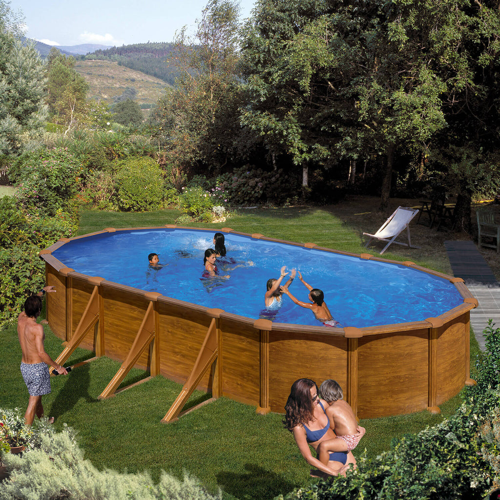 - Piscina ovale a parete in acciaio e decorazione in legno