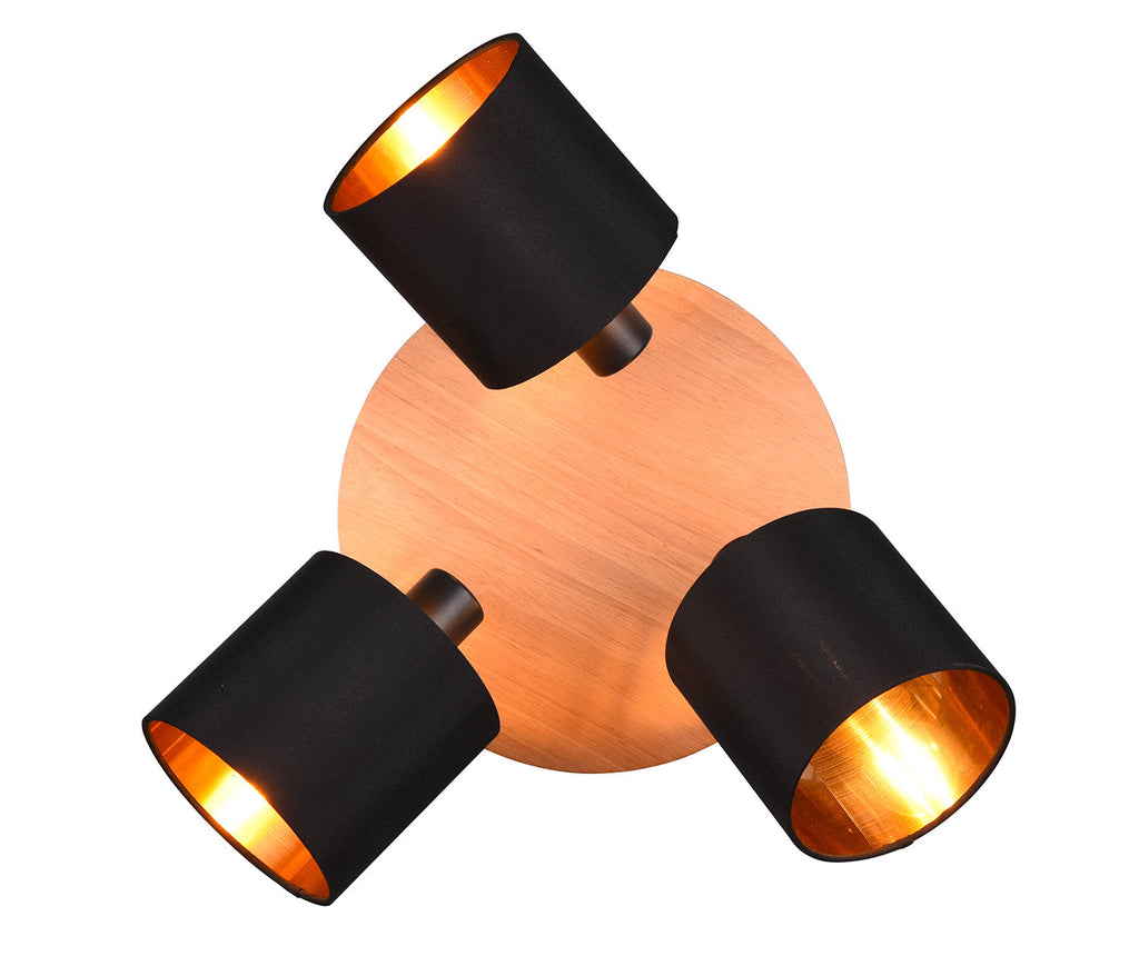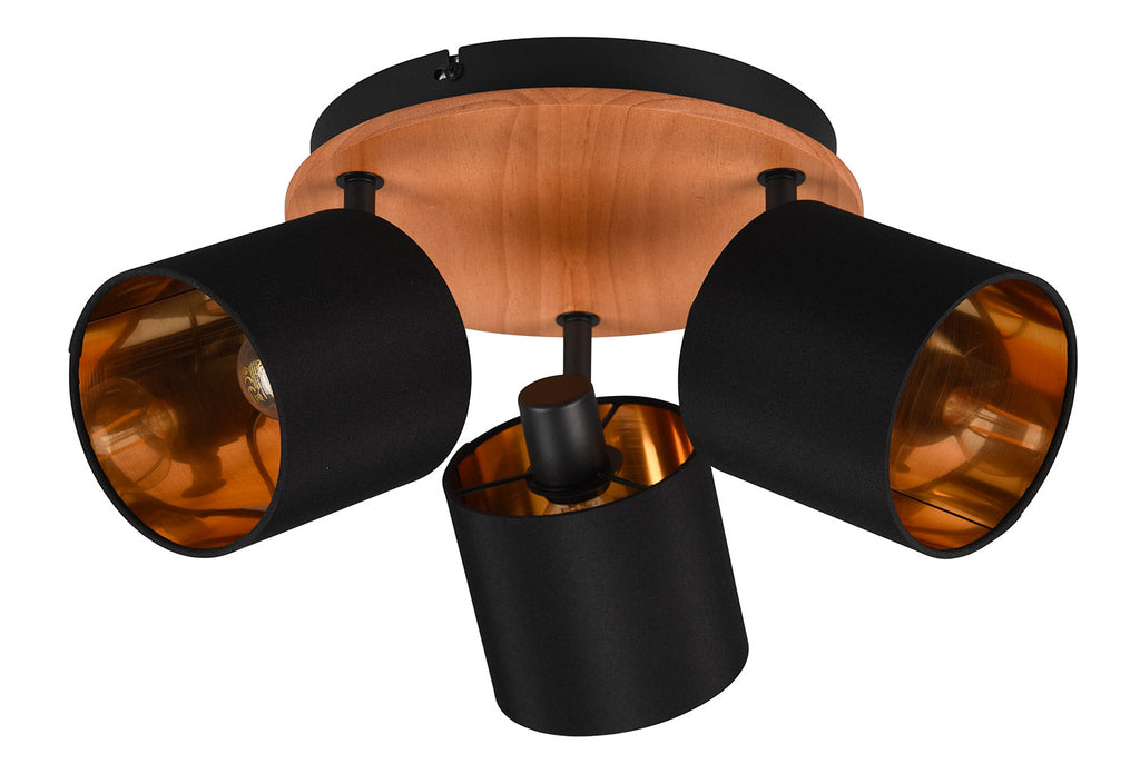 Tommy Plafoniera 3 Spots Base Legno con Paralumi Nero e Oro D. 46,5Cm