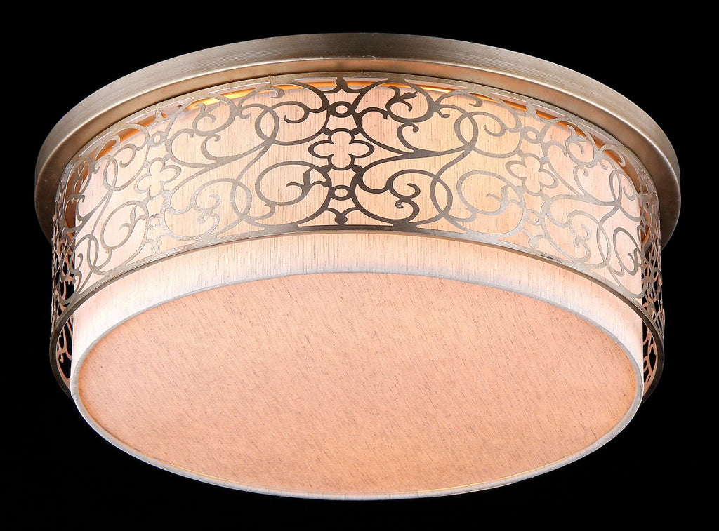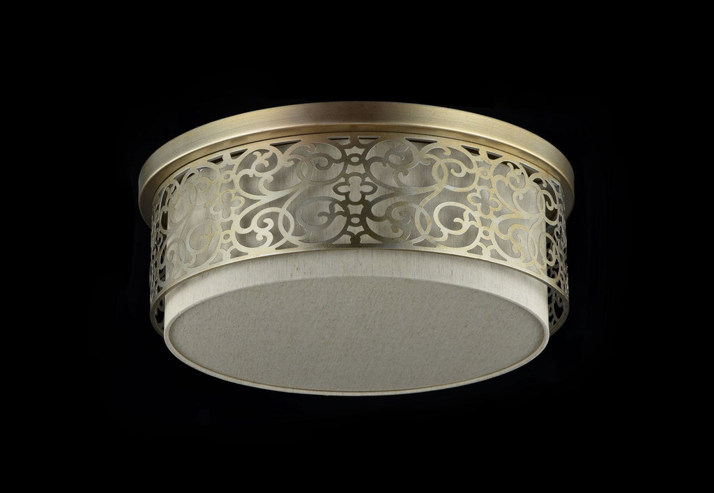 Struttura in Metallolo con decoro stencil. Finitura in ottone. Paralume rivestito in tessuto.