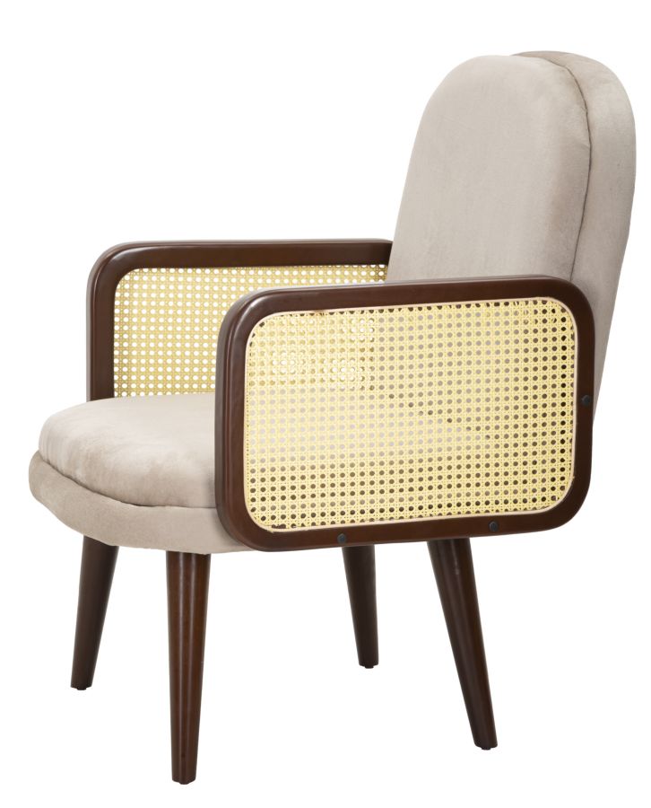 Elegante poltrona in tessuto imbottito con particolari braccioli in legno e paglia di Vienna dal design ispirato agli anni 70.