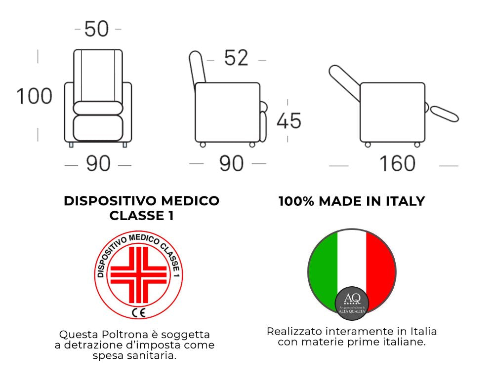Il prodotto è interamente realizzato in Italia, con una garanzia di 2 anni e un ampio servizio di assistenza tecnica diffuso su tutto il territorio nazionale. La qualità di queste poltrone sta nella loro lavorazione artigianale, con materiali di alta qualità e una struttura resistente. Ogni poltrona viene realizzata a mano da un artigiano e viene fornita con garanzia e istruzioni per l'uso. Certificato dispositivo medico classe 1.
